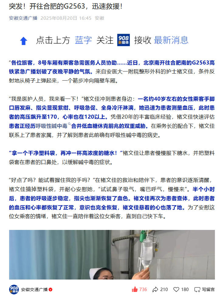 “各位旅客,8号车厢有乘客急需医务人员协助……近日,北京南开往合肥南的G2563高铁紧急广播划破了夜晚平静的气氛。来自安医大一附院整形外科的护士褚文佳,条件反射地从椅子上弹起来,一个箭步冲向隔壁车厢。