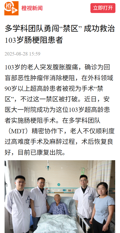 103岁的老人突发腹胀腹痛,确诊为回盲部恶性肿瘤伴消除梗阻,在外科领域90岁以上超高龄患者被视为手术“禁区”,不过这一禁区被打破。近日,安医大一附院成功为这位103岁超高龄患者实施肠梗阻手术。在多学科团队(MDT)精密协作下,老人不仅顺利度过高难度手术及麻醉过程,术后恢复良好,目前已康复出院。