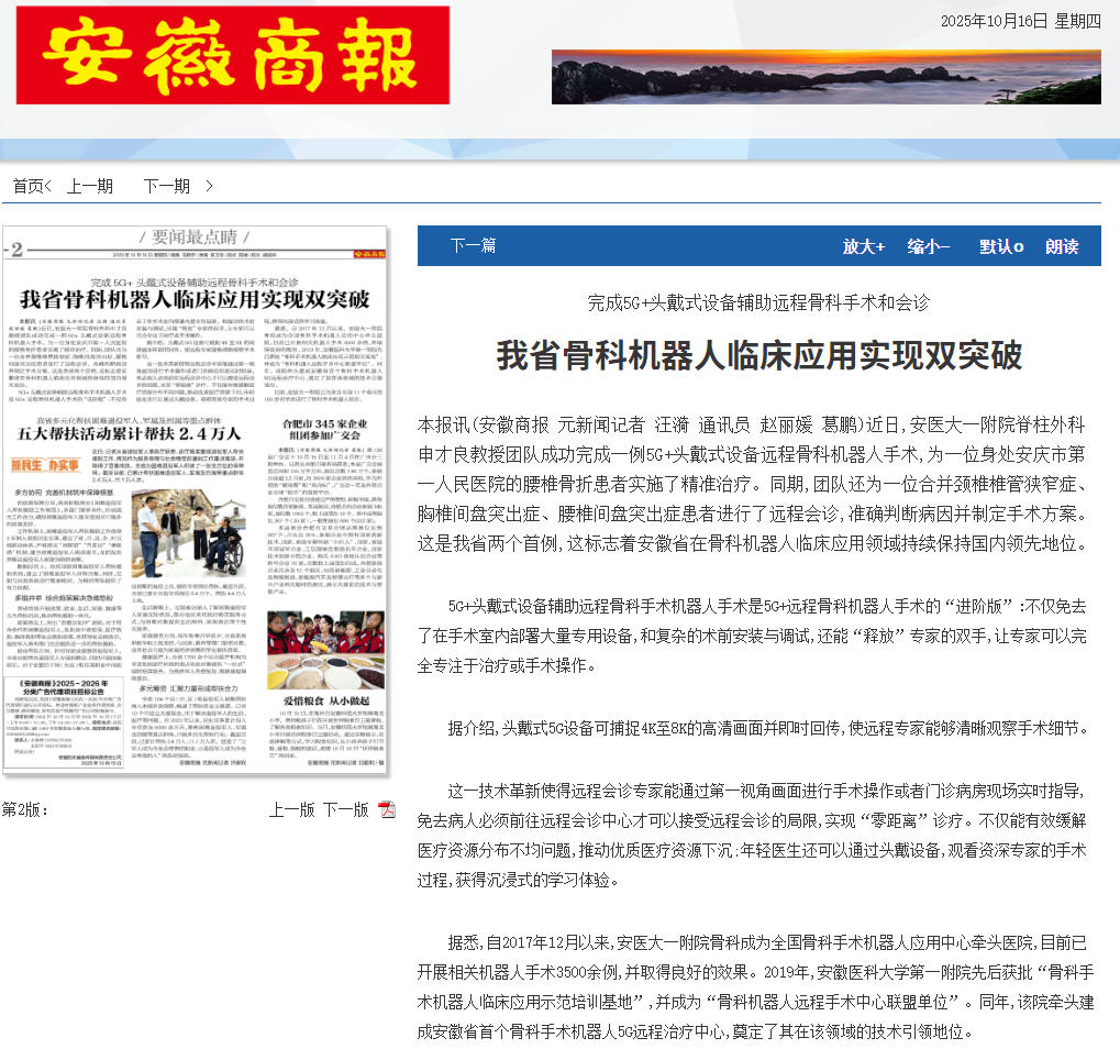 本报讯(安徽商报 元新闻记者 汪漪 通讯员 赵丽媛 葛鹏)近日,安医大一附院脊柱外科申才良教授团队成功完成一例5G+头戴式设备远程骨科机器人手术,为一位身处安庆市第一人民医院的腰椎骨折患者实施了精准治疗。同期,团队还为一位合并颈椎椎管狭窄症、胸椎间盘突出症、腰椎间盘突出症患者进行了远程会诊,准确判断病因并制定手术方案。这是我省两个首例,这标志着安徽省在骨科机器人临床应用领域持续保持国内领先地位。