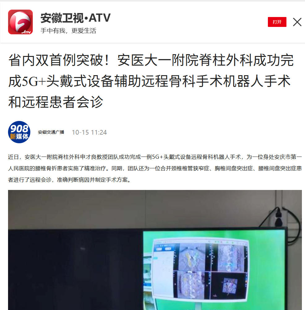 近日,安医大一附院脊柱外科申才良教授团队成功完成一例5G+头戴式设备远程骨科机器人手术,为一位身处安庆市第一人民医院的腰椎骨折患者实施了精准治疗。同期,团队还为一位合并颈椎椎管狭窄症、胸椎间盘突出症、腰椎间盘突出症患者进行了远程会诊,准确判断病因并制定手术方案。