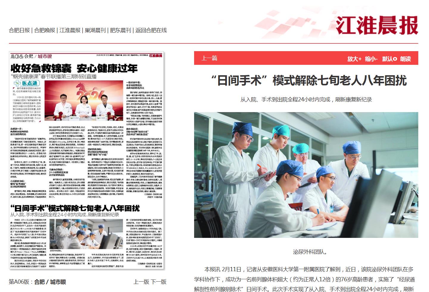 本报讯 2月11日,记者从安徽医科大学第一附属医院了解到,近日,该院泌尿外科团队在多学科协作下,成功为一名前列腺体积超大(约为正常人12倍)的76岁高龄患者,实施了“经尿道解剖性前列腺剜除术”日间手术。此次手术实现了从入院、手术到出院全程24小时内完成,刷新了该类复杂手术快速康复的新纪录。