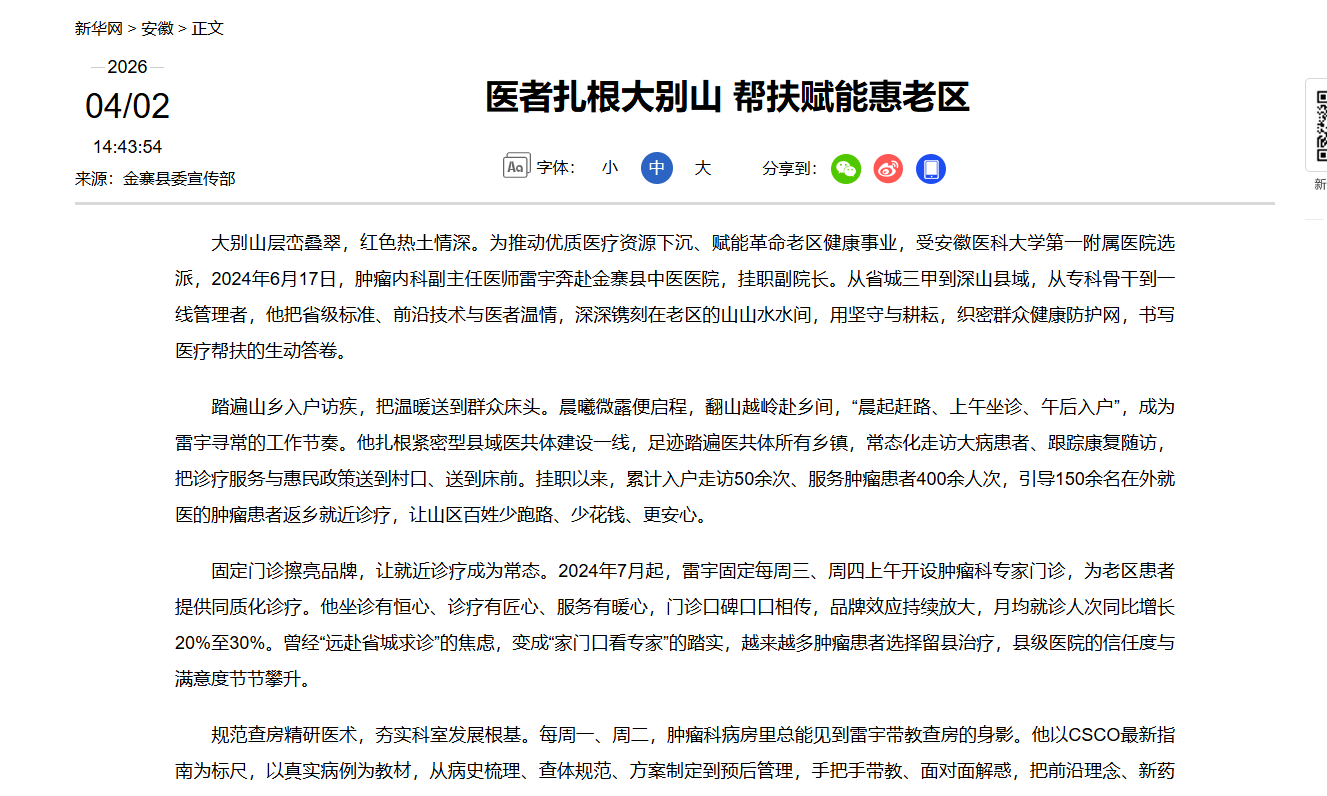 大别山层峦叠翠,红色热土情深。为推动优质医疗资源下沉、赋能革命老区健康事业,受安徽医科大学第一附属医院选派,2024年6月17日,肿瘤内科副主任医师雷宇奔赴金寨县中医医院,挂职副院长。从省城三甲到深山县域,从专科骨干到一线管理者,他把省级标准、前沿技术与医者温情,深深镌刻在老区的山山水水间,用坚守与耕耘,织密群众健康防护网,书写医疗帮扶的生动答卷。