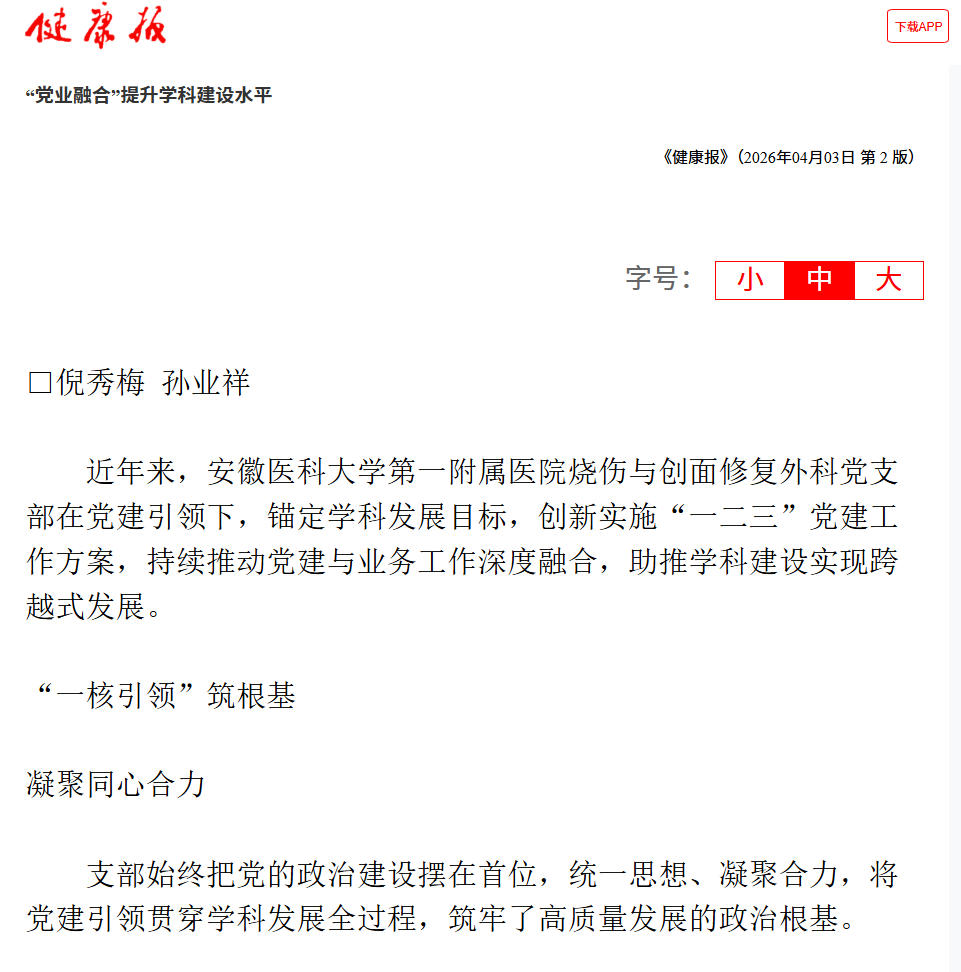 近年来,安徽医科大学第一附属医院烧伤与创面修复外科党支部在党建引领下,锚定学科发展目标,创新实施“一二三”党建工作方案,持续推动党建与业务工作深度融合,助推学科建设实现跨越式发展。