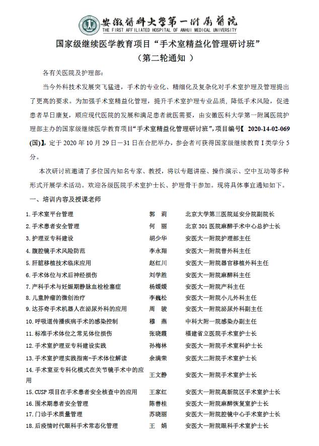 关于举办国家级继续医学教育项目“手术室精益化管理研讨班” 的通知