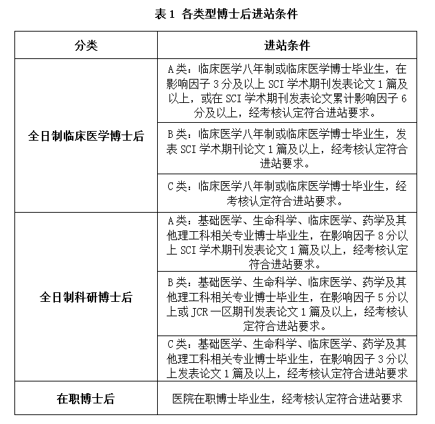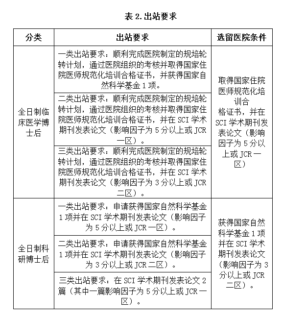 各类博士后出站要求、出站待遇和选留医院条件见表2。
