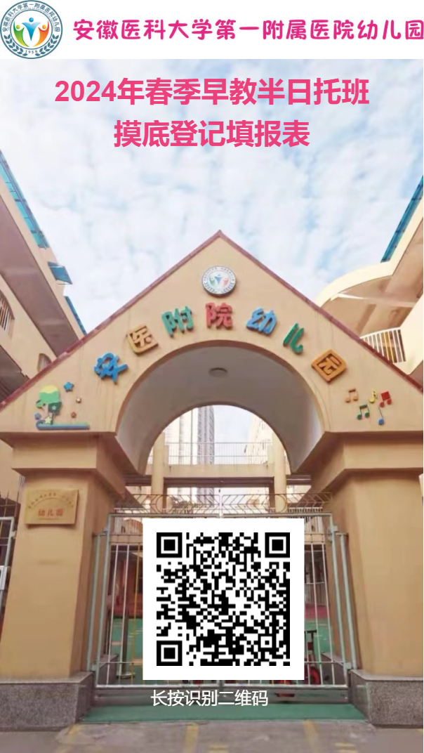 现我园2024年春季早教半日托班开始招生,请符合条件的家长抓紧前来报名,名额有限,额满为止。此通知安徽医科大学第一附属医院幼儿园门口张贴,并同步在医院官网发布,请相互转告。