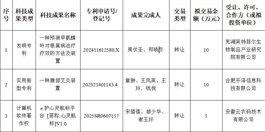 根据《安徽医科大学第一附属医院职务科技成果转化管理办法(试行)》(院科〔2023〕9号)规定,我院拟对以下3项职务科技成果开展转化,现就相关事项公示如下: