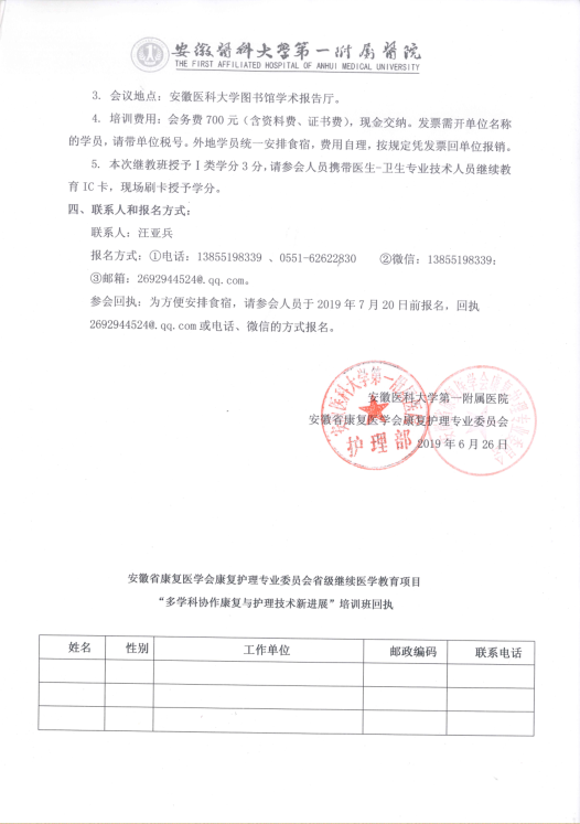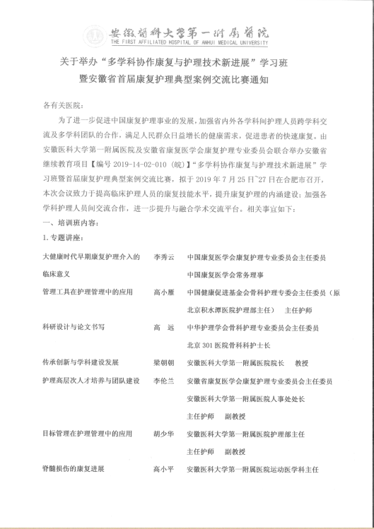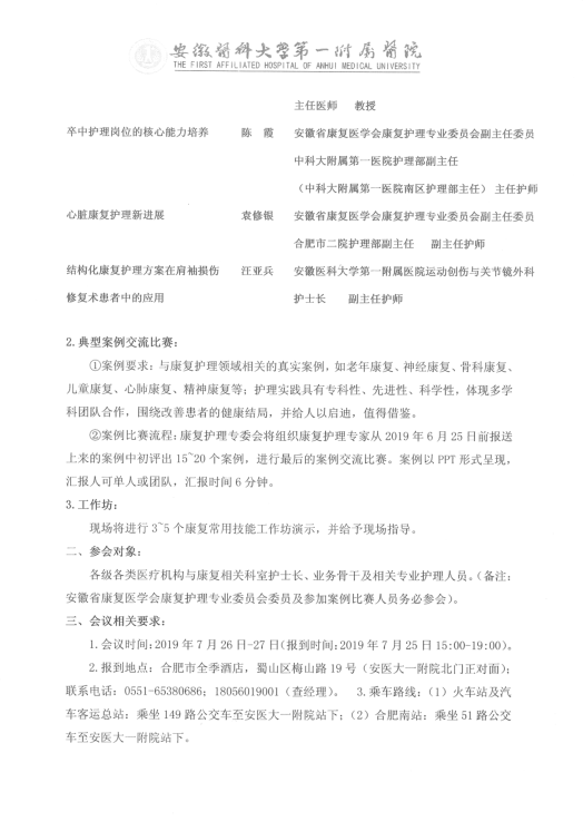 关于举办“多学科协作康复与护理技术新进展”学习班暨安徽省首届康复护理典型案例交流比赛通知