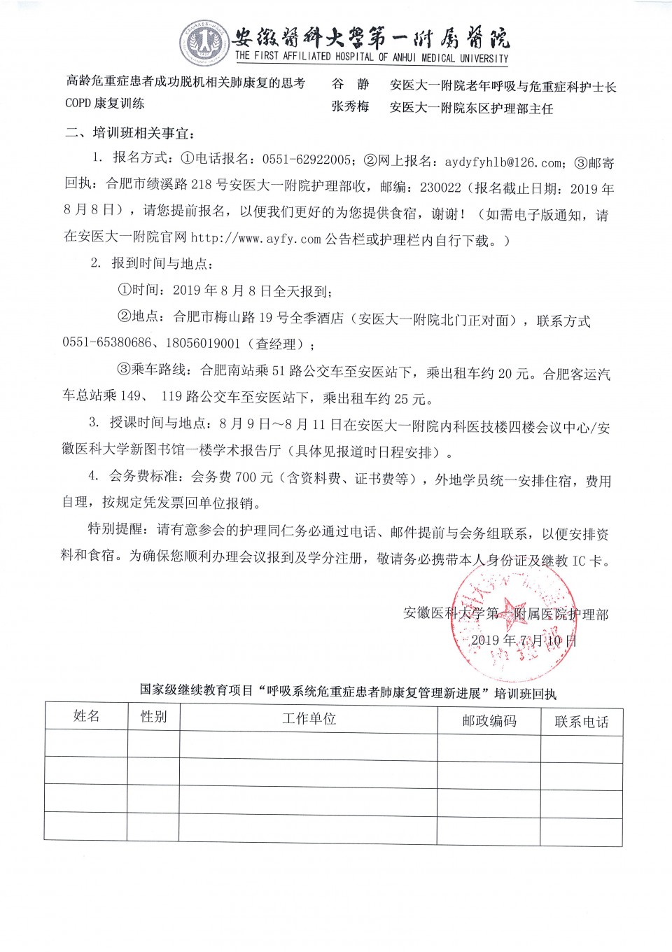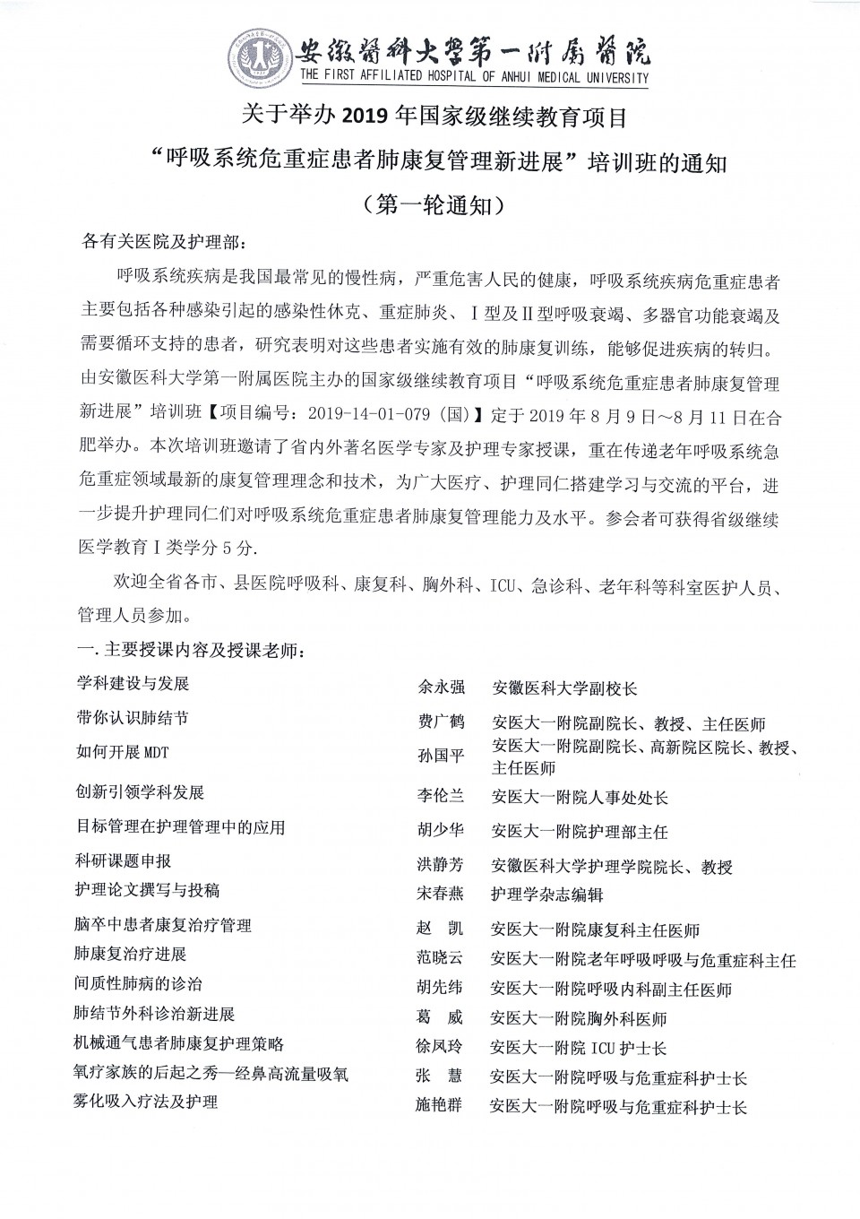 关于举办2019国家级继续教育项目“呼吸系统危重症患者肺康复管理新进展”培训班的通知