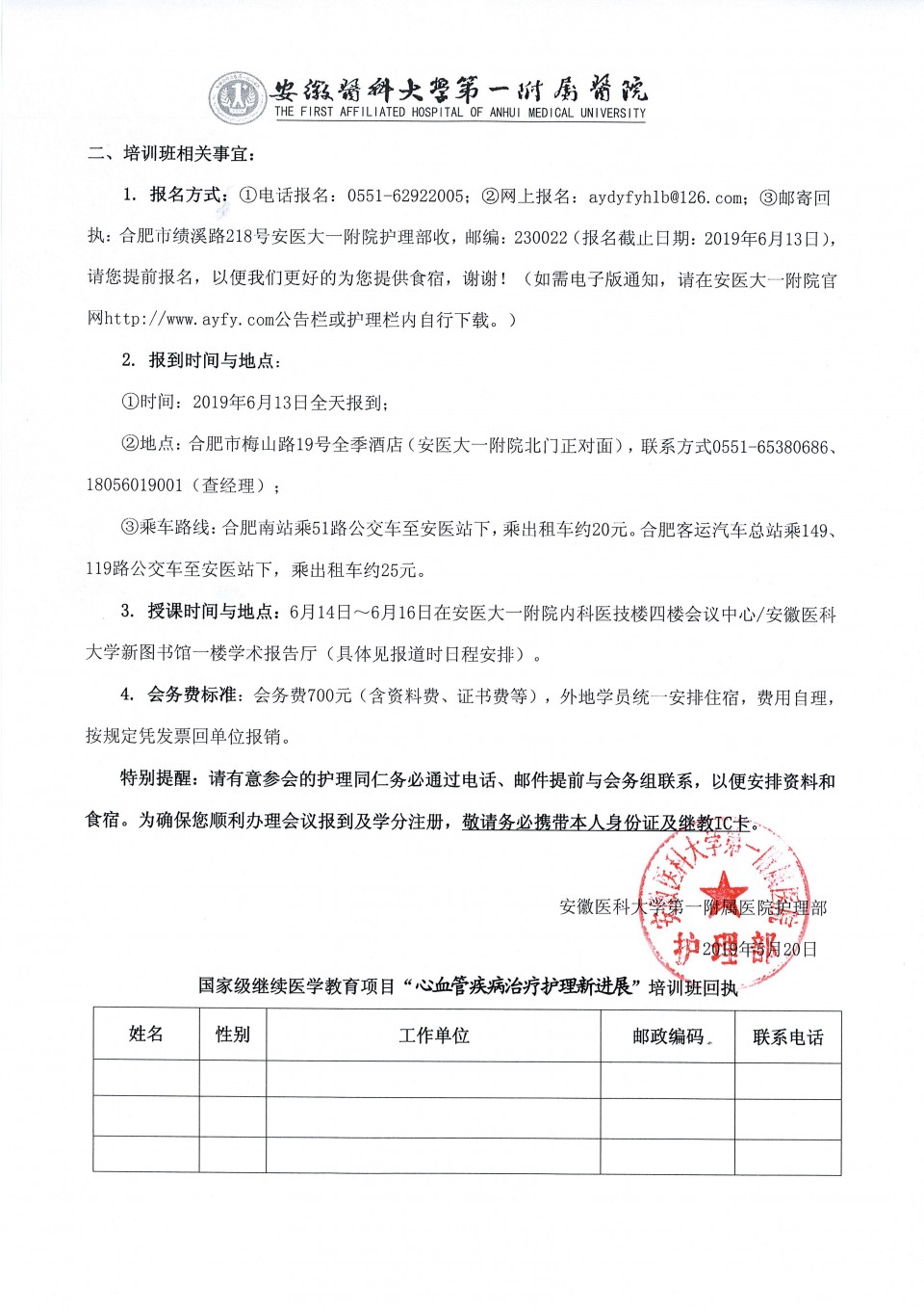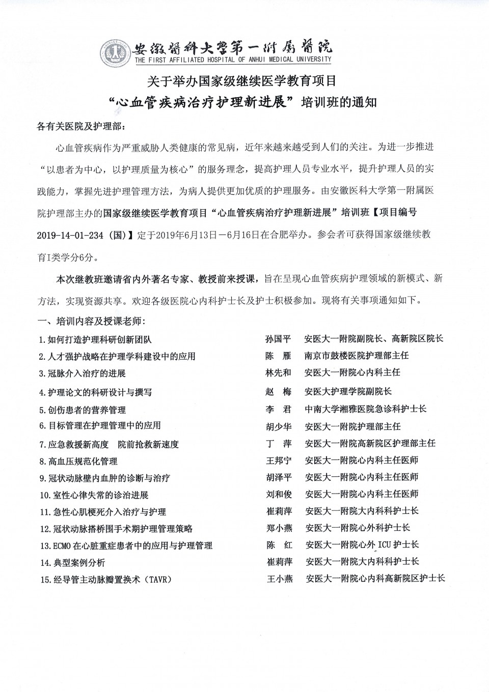 关于举办国家级继续医学教育项目“心血管疾病治疗护理新进展”培训班的通知