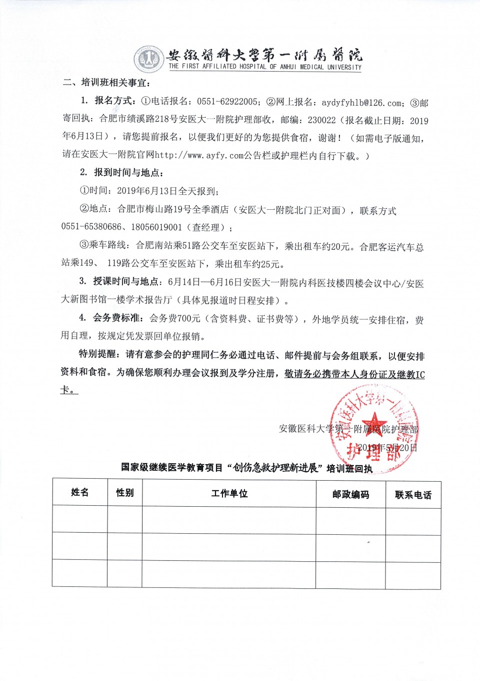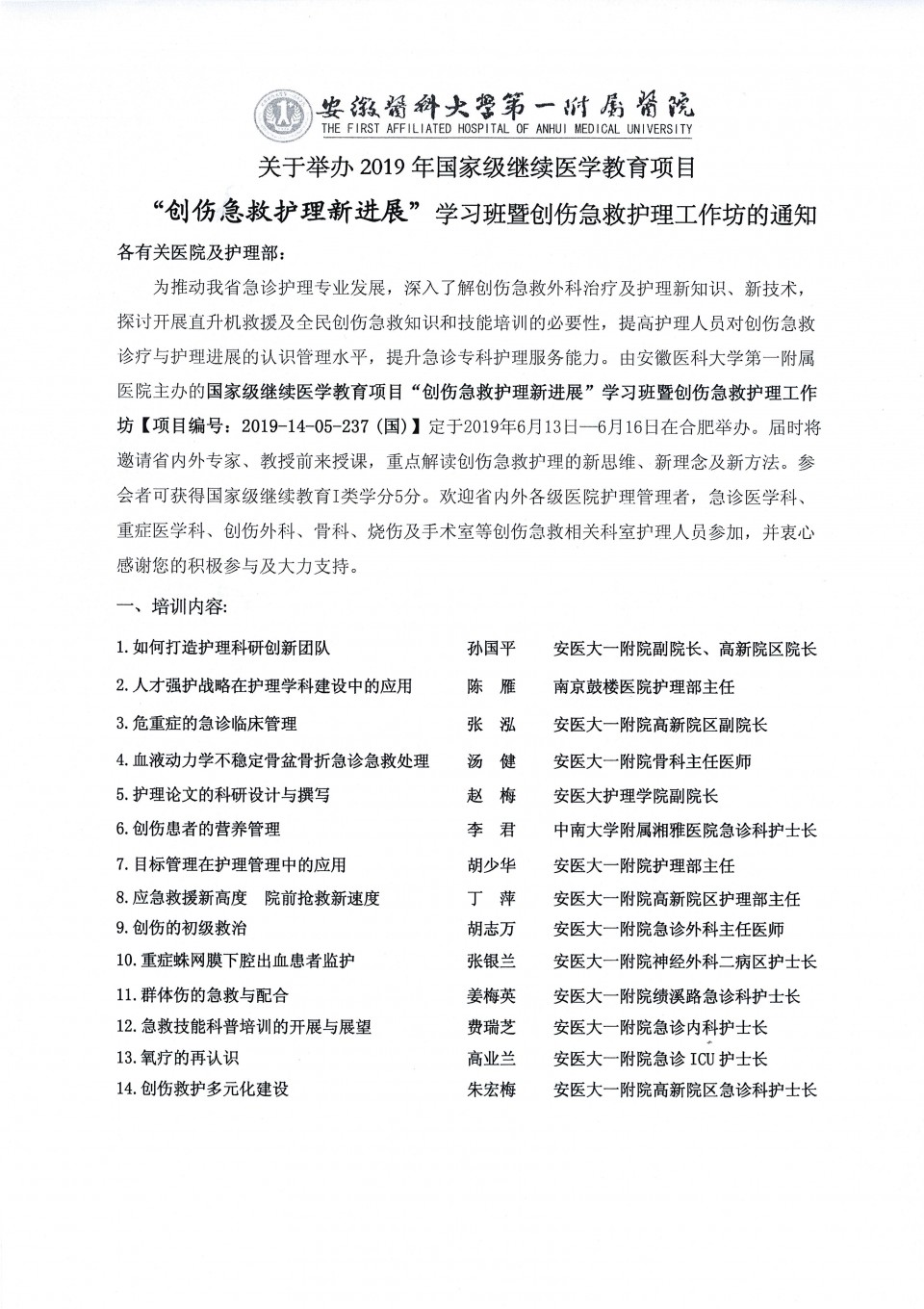 关于举办2019年国家级继续医学教育项目“创伤急救护理新进展”学习班