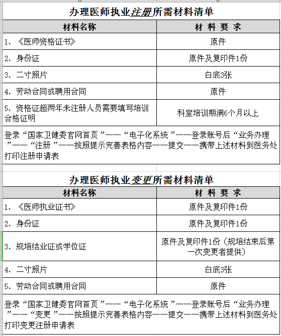 根据国家卫健委《医师执业注册管理办法》和安徽省卫健委关于医师执业注册和变更注册相关规定,我院医师办理执业注册和执业变更需要提供以下材料:
