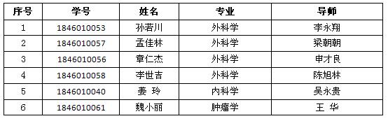 根据《关于印发< 安徽医科大学“卓越博士生教育培养提升计划”项目实施方案(试行)>的通知》(校研字〔2018〕1号)及《关于做好2018年“卓越博士生教育培养提升计划”项目申请选拔工作的通知》(研字〔2018〕54号)要求,经个人申请、导师推荐、科研处审核,拟推荐孙若川等6名博士生进入该计划项目,现予以公示,公示时间:2018年10月23日-25日。如有异议,请于10月25日前向医院科研处反映,电话:0551-62922831。