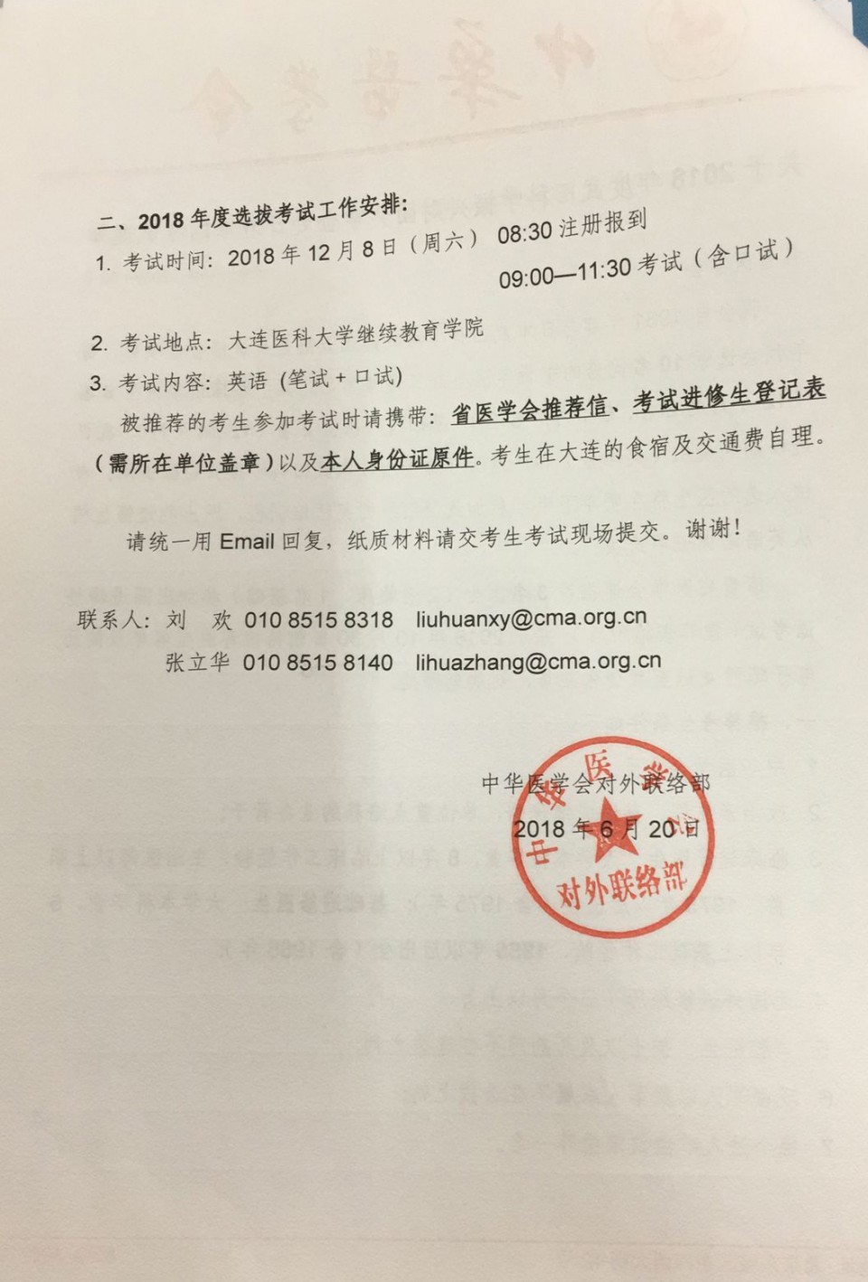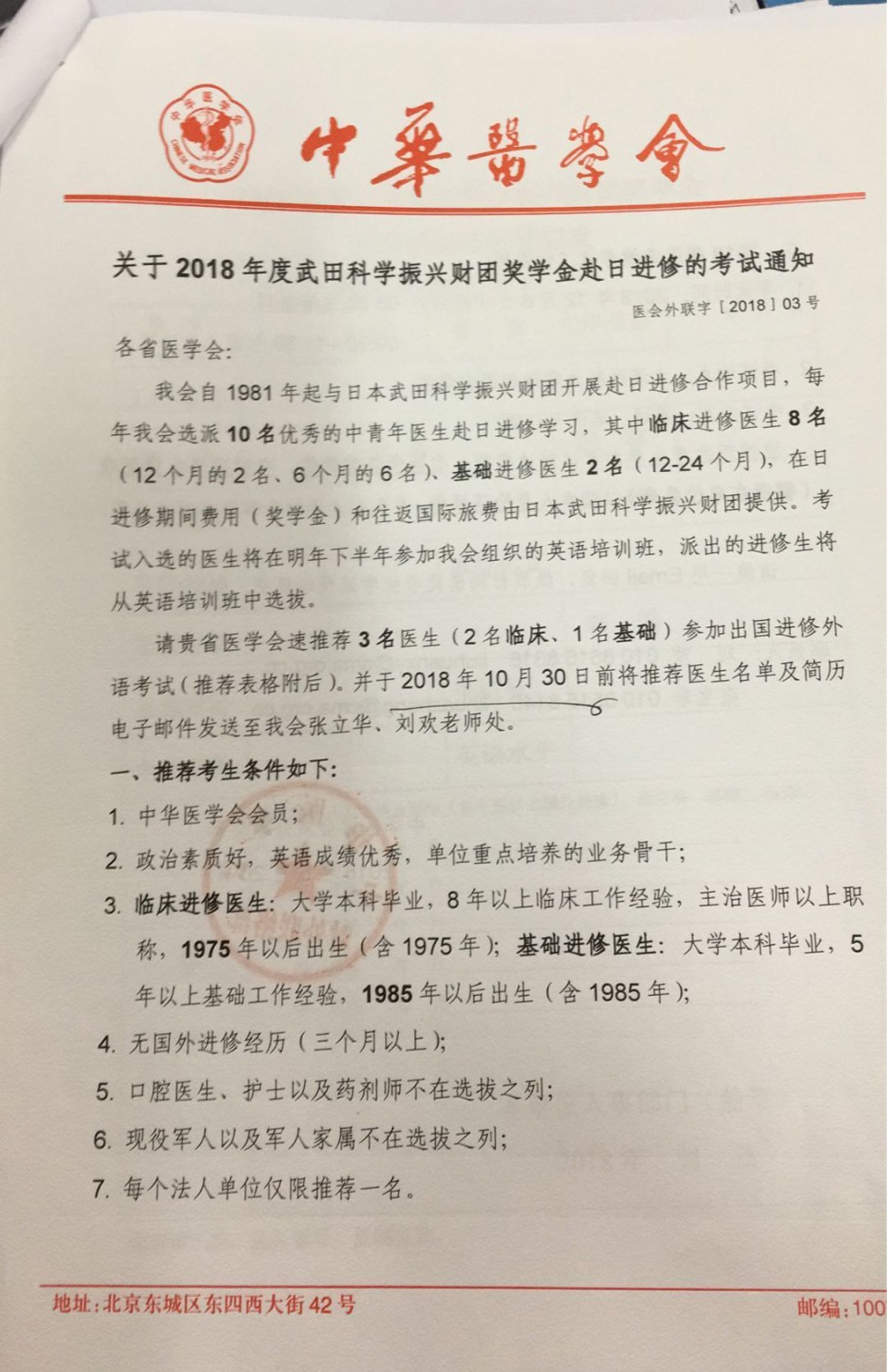 接中华医学会医会外联字〔2018〕03号“关于2018年度武田科学振兴财团奖学金赴日进修的考试通知”,分配我省3名参加出国进修外语考试名额。经医学会秘书长办公会议研究,现将“通知”转发给你单位,请按“通知”要求办理推荐1名临床进修医生,并于10月10日之前将推荐同志的表格及简历邮寄或送至我会学术会务部(合肥市龚湾路15号,邮编230061,联系电话:0551-62822919,联系人:陶丹),同时将电子版发送至邮箱:caosheny@sina.com。经我会初审后统一上报。