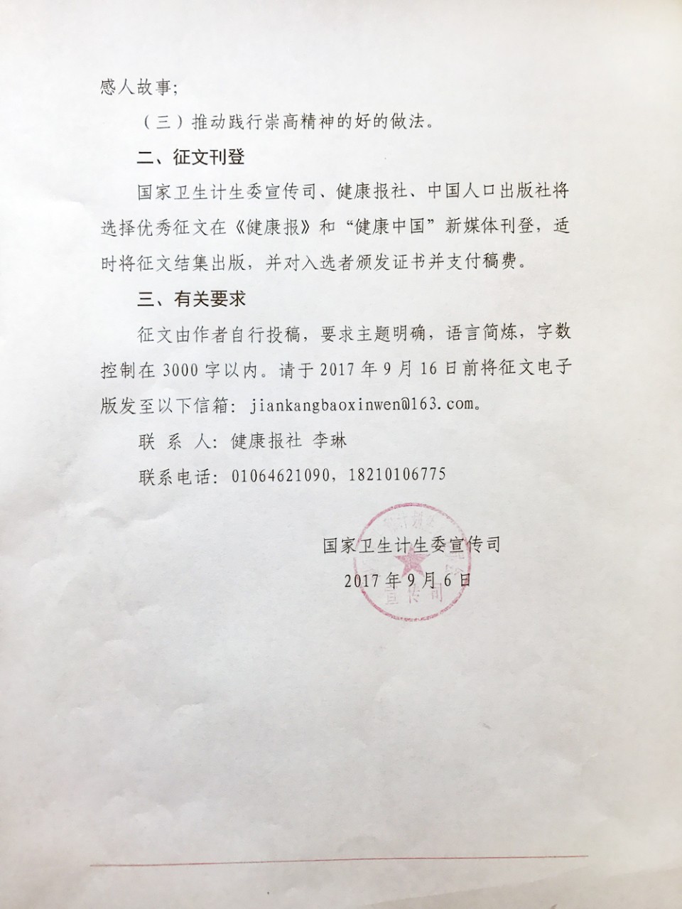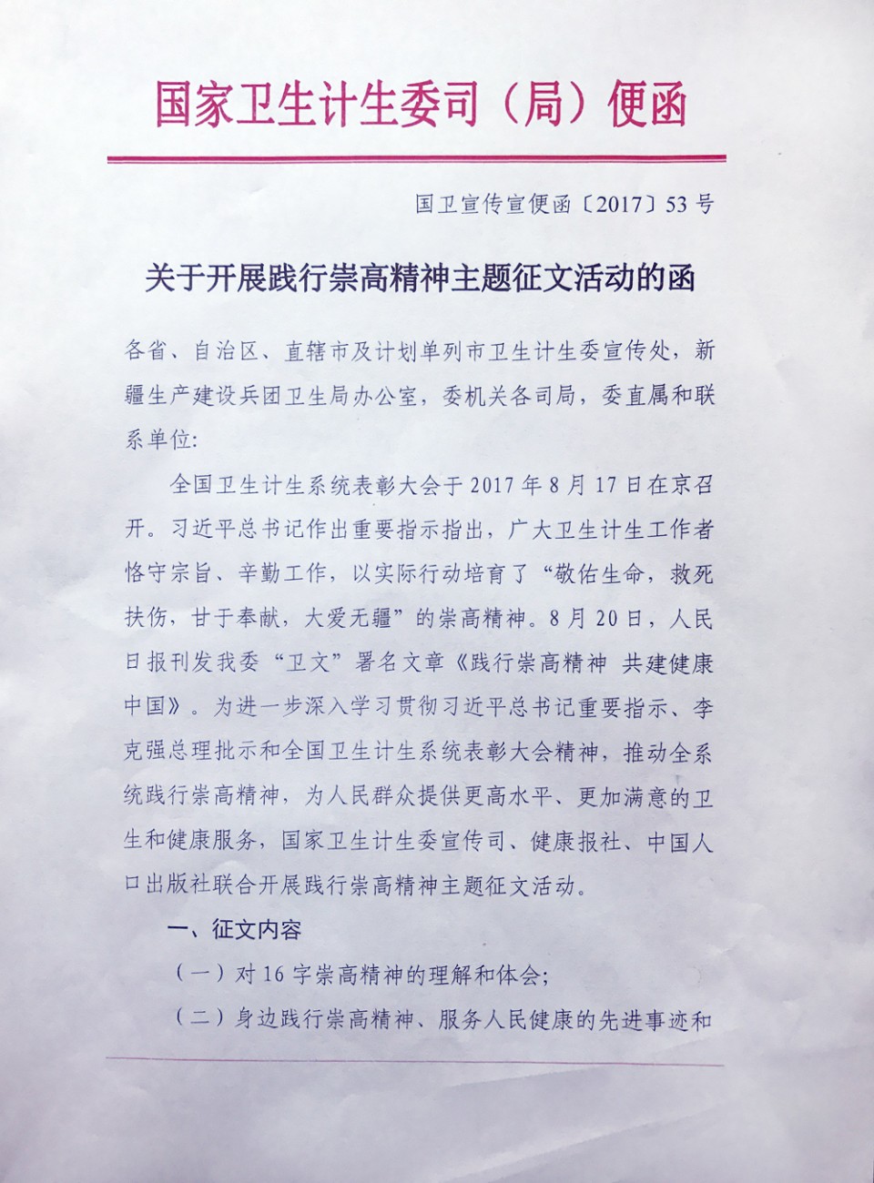 转发国家卫计委《关于开展践行崇高精神主题征文活动的通知》
