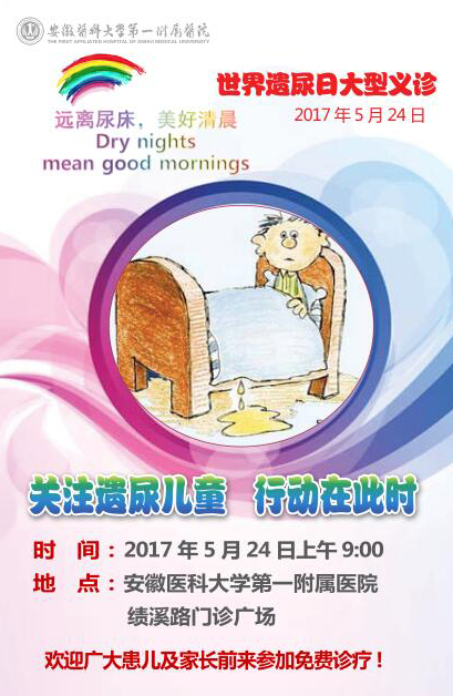 5月22日是第3个世界遗尿日。5月24日上午9:00,在安医大一附院绩溪路门前广场将有世界遗尿日义诊活动,广大患儿及家长可以前往免费参加诊疗。