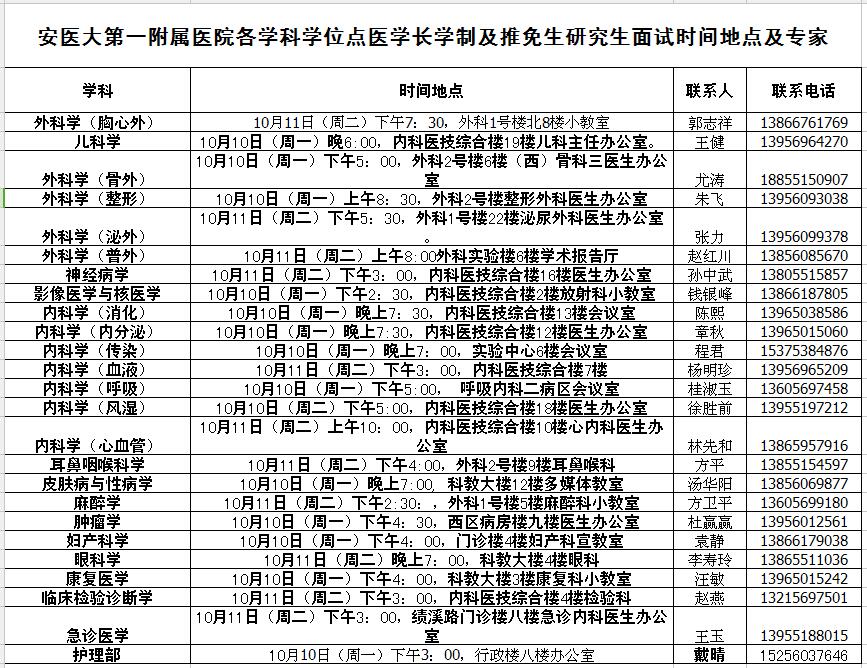 安医大第一附属医院各学科学位点医学长学制及推免生研究生面试时间地点及专家