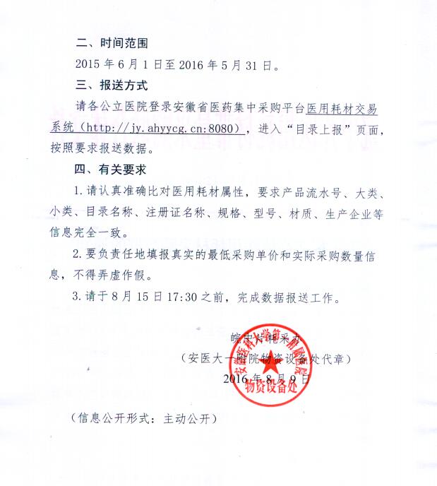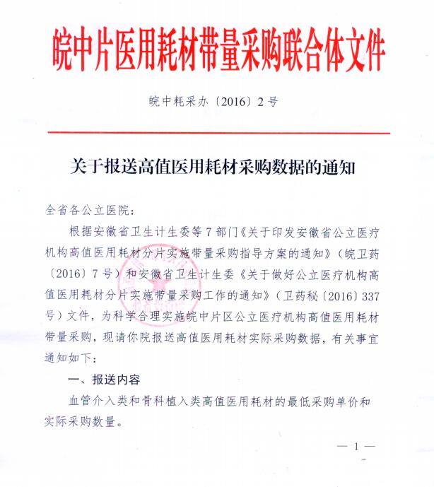 关于报送高值医用耗材供货数据的通知 皖中耗材办[2016]2号
