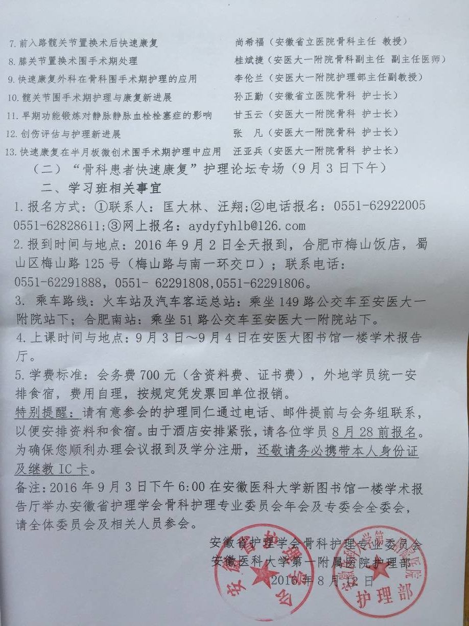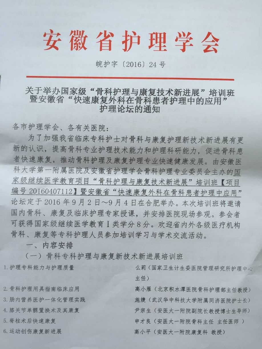 关于举办国家级“骨科护理与康复技术新进展”培训班暨安徽省“快速康复外科在骨科患者护理中的应用”护理论坛的通知