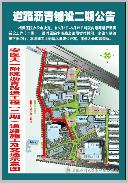 根据医院办公会决定,自5月3日-5月15日对院内道路进行沥青铺设工作{二期},届时医院水湖路全路段暂时封闭,来往车辆请按下图绕行。本院职工上班请尽量减少开车,不便之处敬请谅解。