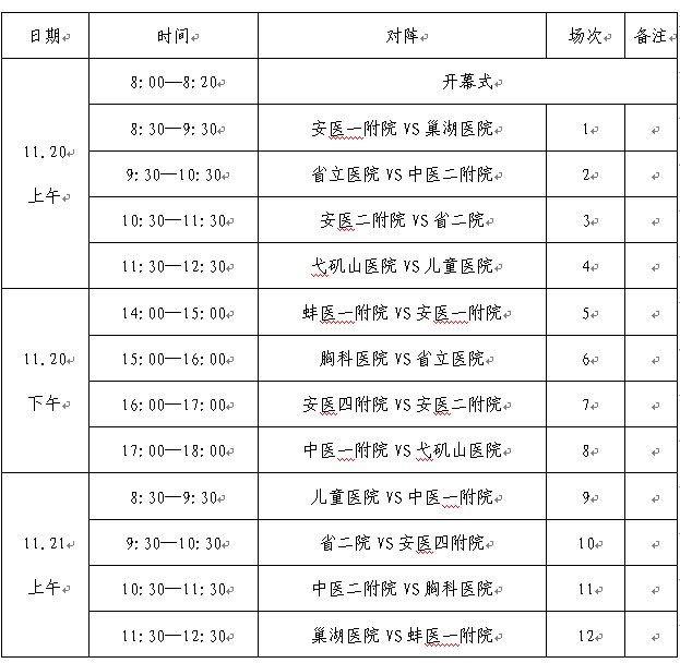由我院工会主办的2015年安徽省省级医院篮球邀请赛将于2015年11月20日至22日在安徽省体育场篮协篮球馆(芜湖路体育场)举行,届时将有全省12家省级医院的篮球爱好者相互交流、切磋球技,欢迎广大职工及篮球爱好者前往观看。具体比赛赛程安排见附表。工会 篮球协会