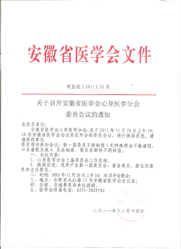 关于召开安徽医学会心身医学分会委员会议的通知