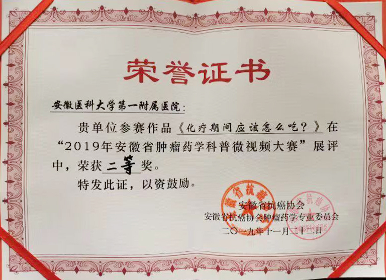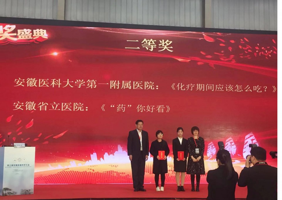 11月22日,我院药剂科的江洁美、何峰、唐艳三位药师创作的药学科普微视频《化疗期间应该怎么吃》,在“2019年安徽省肿瘤药学科普微视频大赛”全省十一家医院选拔出来的参赛作品中,脱颖而出,获得了总分第二名的好成绩。安徽省抗癌协会,安徽省抗癌协会肿瘤药学专业委员会为获奖者颁发了二等奖荣誉证书。据悉,近年来,药剂科一直致力于药学科普的创作和宣传工作。通过建立药学服务微信公众号,结合热点问题,进行科普文章推送;与安徽省广播电台合作建立“用药那些事儿”抖音账号,制作了儿科用药、夏季用药用药、消化科用药等常见用药问题的科普视频;走进基层、走进社区、走进贫困村开展线下合理用药科普宣教;组织和编写了大型药学知识普及丛书《药,你用对了吗?》,并评为2019安徽省优秀科普作品。