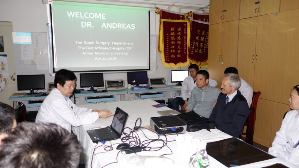 4月22日,受安徽医科大学第一附属医院脊柱外科申才良主任的邀请,瑞士著名脊柱外科专家Andreas Panoussopoulos教授来我院脊柱外科进行学术交流。Panoussopoulos教授是瑞士著名脊柱外科专家,长期在苏黎世Hirslanden医院的脊柱外科开展临床和教学工作,撰写过多部专著及学术论文,现为该院主任医师。
