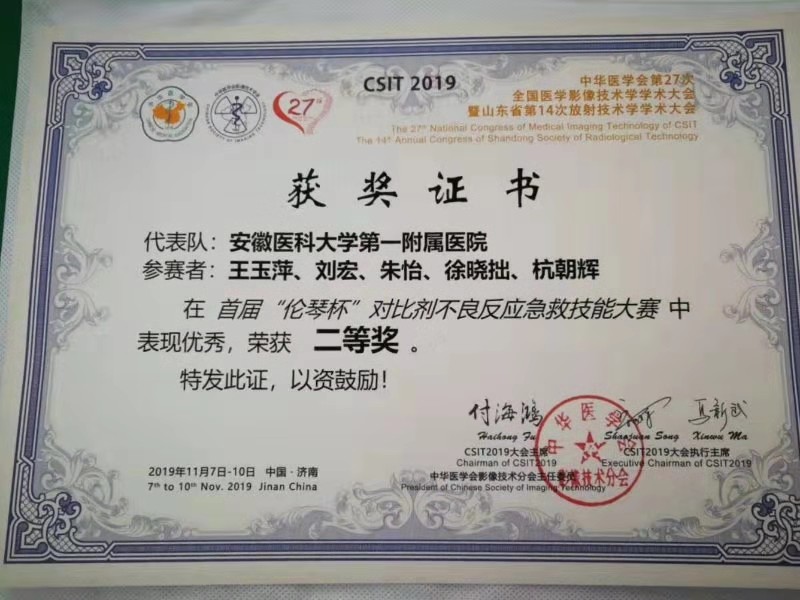 这是我院医学影像科首次以医、技、护为团队参加的大型比赛。通过此次比赛,进一步强化了安全与规范意识,提高了对比剂不良反应的预防和处理技能,构建了影像科医、技、护一体化合作模式,体现了团结协作、积极进取的精神风貌,为医院争得了荣誉。
