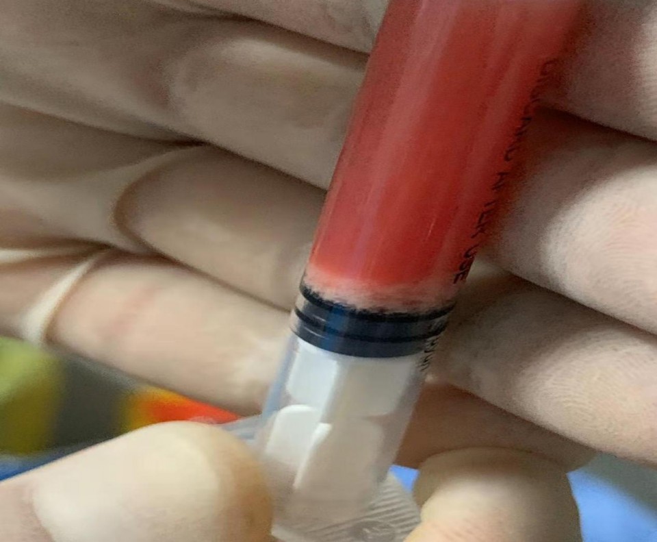 抽吸物内可见白色牙膏样沉积物