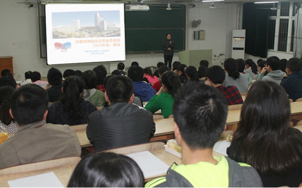 为了深入贯彻学习国家卫计委《抗菌药物临床应用指导原则》(2015版),近一步加强我院抗菌药物临床管理应用,发挥药师在促进合理应用抗菌药物的作用,保证我院用药安全和提高药学服务水平。11月4日晚,药剂科在安徽医科大学14101教室举办了新版《抗菌药物临床应用指导原则》专题培训讲座,药剂科主任许杜娟主任药师为全体药剂科工作人员以及实习进修人员进行了专业培训。许杜娟主任首先详细阐述了抗菌药物治疗性应用基本原则、非手术患者及围手术期抗菌药物预防性应用原则等方面,结合临床案例就给药途径、品种选择、给药方案制定等做出了精准的讲解,并对抗菌药物临床应用管理进行了系统性的分类。同时对2015年版《抗菌药物临床应用指导原则》中的更新内容做了归纳总结,对新版指导原则的重点内容进行了解读。