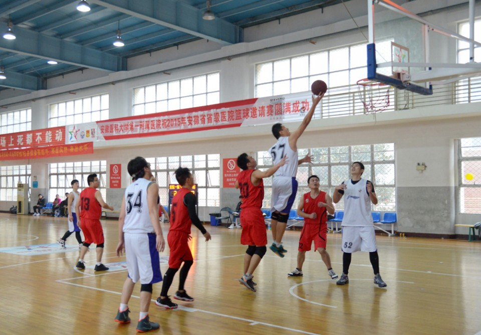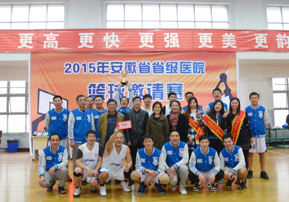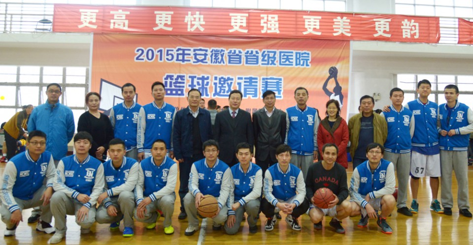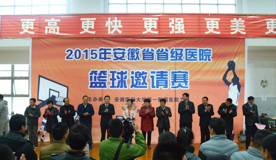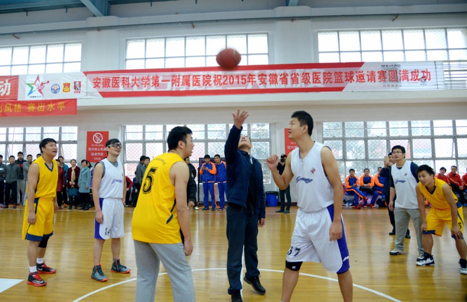 为增进各省级医院之间的友谊和交流合作,11月20日-22日,在医院工会、篮球协会的精心组织、策划下,2015年安徽省省级医院篮球邀请赛在安徽省体育场篮球馆顺利举行。参加比赛的有安徽医科大学第一附属医院、安徽省立医院、皖南医学院弋矶山医院、蚌埠医学院第一附属医院、安徽医科大学第二附属医院、安徽省胸科医院、安徽省儿童医院、安徽医科大学附属巢湖医院、安徽中医药大学第一附属医院、安徽中医药大学第二附属医院、安徽省第二人民医院、安徽医科大学第四附属医院等12支代表队。11月20日上午,我院党委书记梁朝朝、院长余永强、党委副书记戴晓支、工会负责人、各参赛医院的领导及队员出席了开幕式。开幕式由党委副书记戴晓支主持,党委书记梁朝朝致开幕词,其代表医院对各兄弟医院的参加表示热烈的欢迎、并希望能通过本次比赛,增进友谊、拓展交流与合作。开幕式结束后,随着“唰”的一声哨响,余永强院长将篮球抛向空中,为揭幕战我院与巢湖医院的比赛开球,正式拉开了篮球邀请赛的序幕。