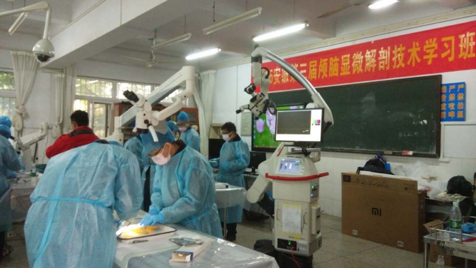 11月15日—11月22日,医院神经外科联合大学解剖教研室成功举办了“第三届安徽省颅脑解剖与显微手术技术培训班。本次培训班特别邀请了首都医科大学附属北京天坛医院神经外科专家汤劼教授进行神经外科解剖与手术入路专题讲座。课程除以往显微镜下操作培训外,还融入了神经内镜相关教学,并配备3D视频手术教学录像。硬件设施和课程设置均达到国内先进水平。培训期间,神经外科程宏伟、王斌、李志范、王卫红、王先祥及程宝春等多位专家参加授课,授课教师认真负责,学员学习积极热情。
