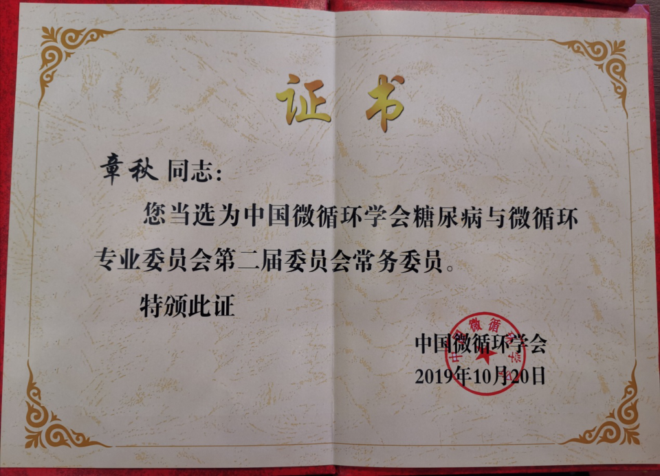 10月25号,中国微循环学会糖尿病与微循环专委会换届改选在江苏省常州市举行。我院内分泌科章秋教授全票当选常务委员。