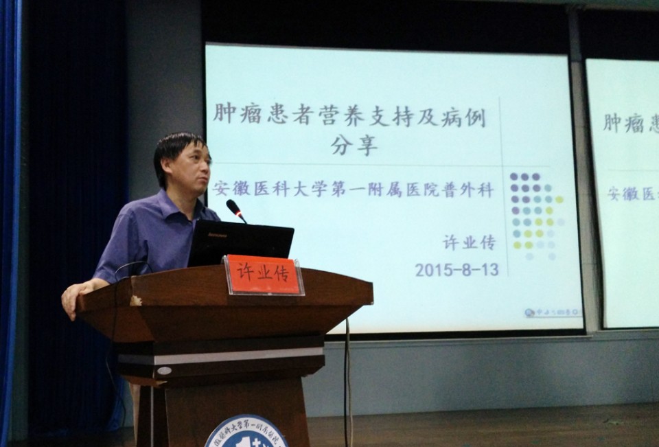 8月13日晚,由医务处、教育处、科研处主办,多学科诊治分中心承办的“2015年安医大一附院中青年医师‘三基三严’系列培训”第七讲,在内科楼四楼会议室开讲。讲座由许建明教授主持,来自全院的中青年医生、培训医生和研究生前来听课。 此次讲座由许业传主任主讲《肿瘤患者营养支持及病例分享》。
