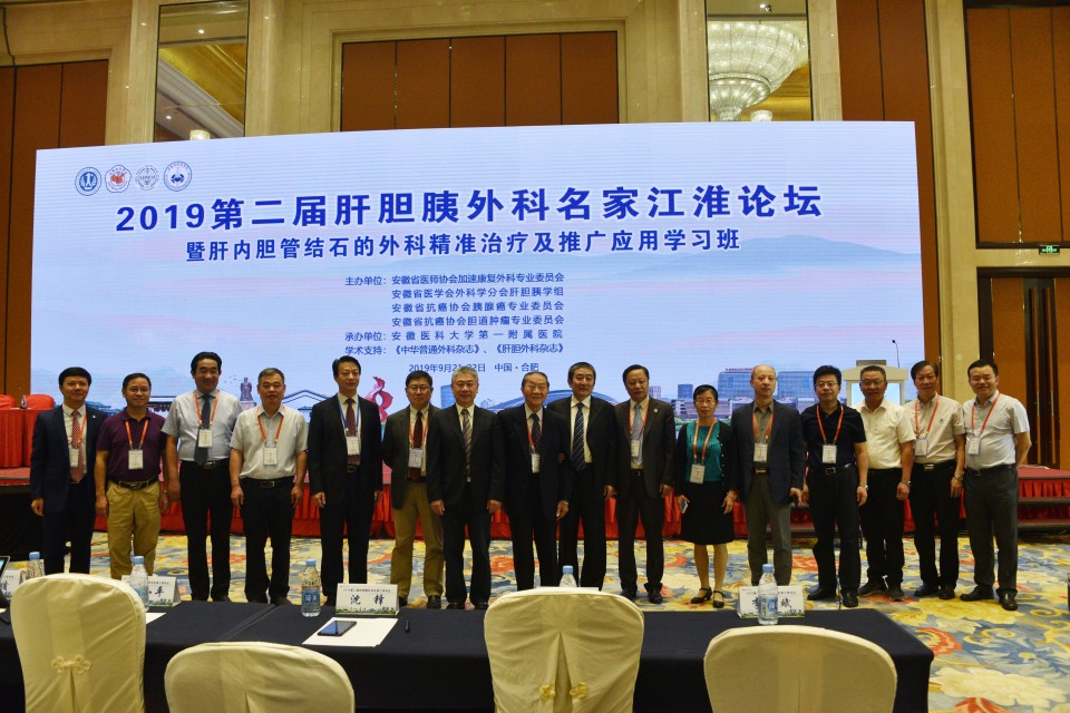 9月21日-22日,由安徽省医师协会加速康复外科专业委员会,安徽省医学会外科学分会肝胆胰学组,安徽省抗癌协会胰腺癌和胆道肿瘤专业委员会主办,安徽医科大学第一附属医院承办的2019年第二届肝胆胰外科名家江淮论坛暨肝内胆管结石的外科精准治疗及推广应用学习班在合肥丰大国际酒店顺利召开。来自全国及省内的外科学及相关学科的400余名医护人员参加了本次学术盛会,医院常务副院长李家斌教授及安徽省医学会外科学分会主任委员耿小平教授致欢迎词,对学习班的举办给予了高度的肯定。会议由安徽省医师协会加速康复外科专业委员会主任委员、肝胆胰外科病区主任刘付宝教授主持。