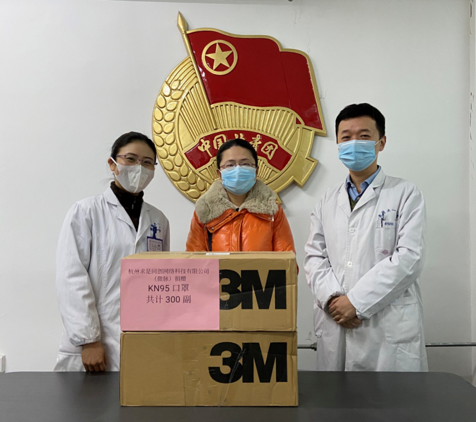 一方有难八方支援,在这抗击疫情的紧要关头,社会爱心人士纷纷向医院伸出援手,提供紧缺的防护物资。1月31日,杭州求是同创网络科技有限公司(微脉)通过院团委向我院捐赠KN95口罩(3M)共计300副,院团委当即将收到的防护物资送到医院物资设备处手中。
