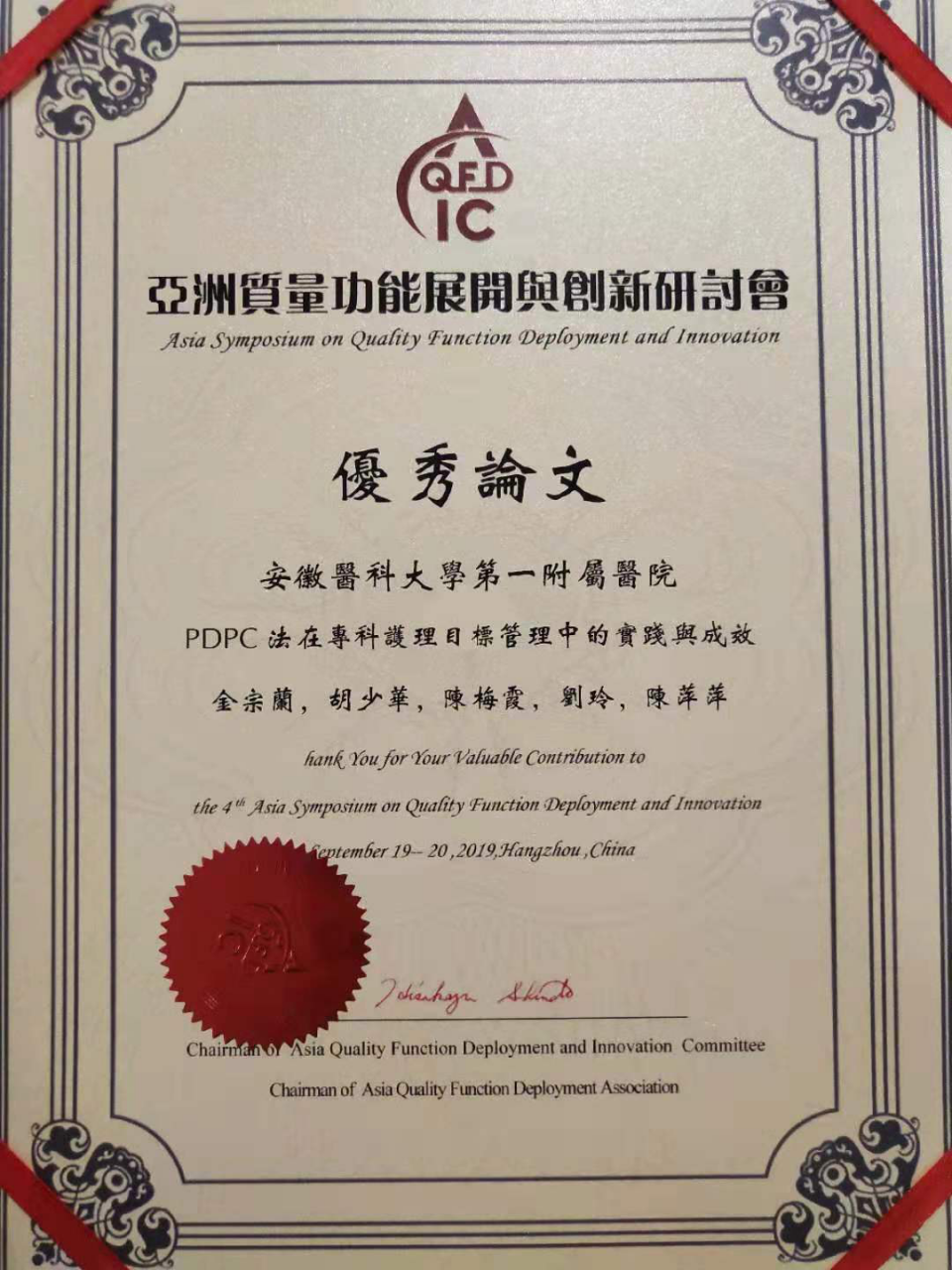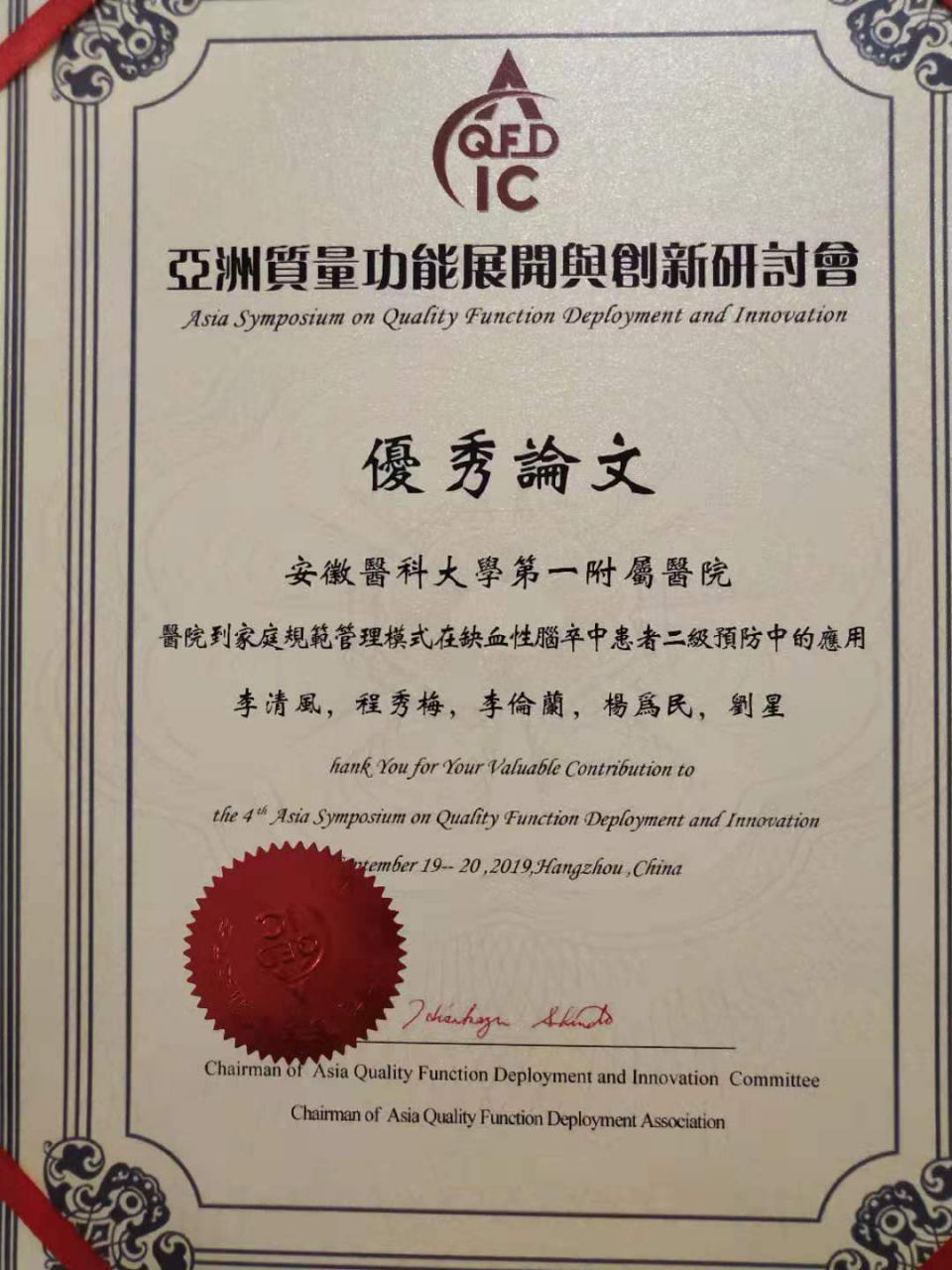 同时,在亚洲质量功能展开与创新研讨会论文交流分会场中,我院泌尿外科金宗兰护士长等开展的“PDPC法在专科护理目标管理中的实践与成效”和护理部李清风等开展的“医院到家庭规范管理模式在缺血性脑卒中患者二级预防中的应用”两篇论文荣获优秀论文奖。