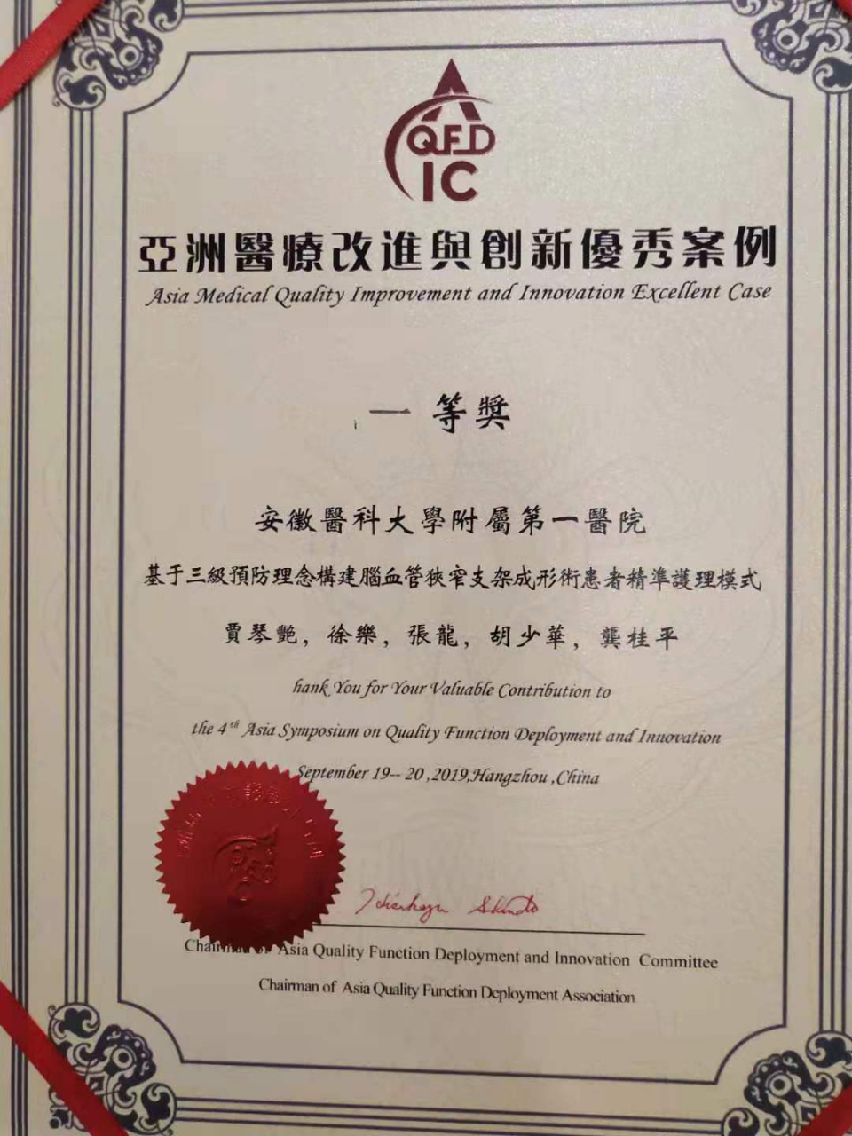 9月18- 20日, 第四届亚洲质量功能展开与创新研讨会暨质量功能展开与创新案例大赛在杭州召开,来自国内外医院的五百余代表参与了此次大会。我院神经内科“安神圈”以“基于三级预防理念构建缺血性脑卒中患者精准管理模式”为主题进行项目汇报,荣获大赛一等奖。