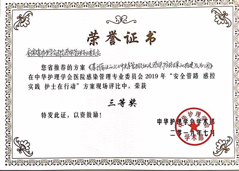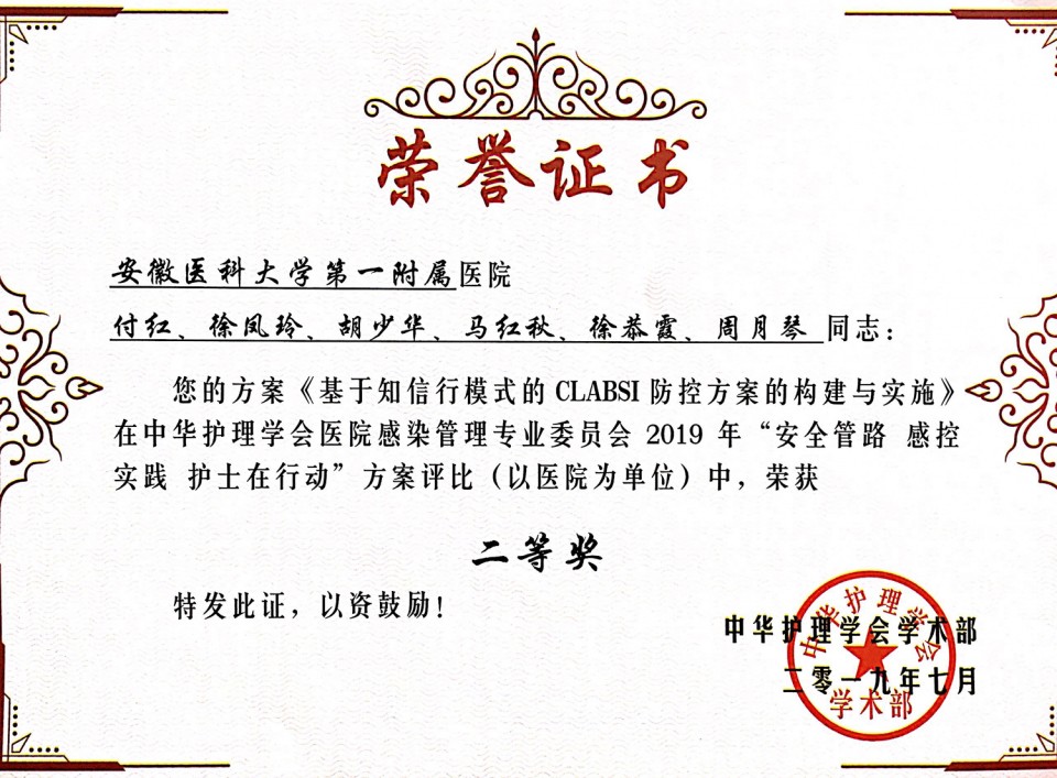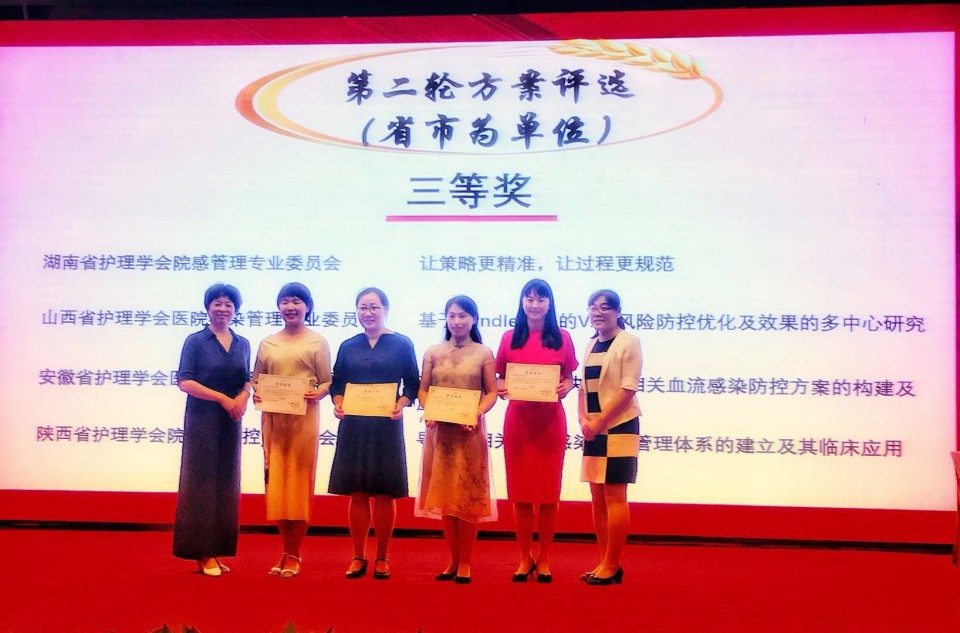 7月28日,由中华护理学会医院感染管理专业委员会主办的全国医院感染管理新进展研讨会在杭州举行。会上对2019年全国“安全管路 感控实践 护士在行动”方案评比活动进行现场汇报及表彰。我院护理部提交的《基于知信行模式的CLABSI防控方案的构建与实施》方案,从全国167家医院的评比中脱颖而出,荣获全国“二等奖”。此外,《基于循证的CLABSI防控方案的构建与应用》方案代表安徽省参加全国16个省市的现场汇报评比,荣获全国“三等奖”。据悉,该项目由护理部组织,重症医学科徐凤玲护士长牵头开展,神经内科ICU付红护士长负责督导,科室感控护士徐恭霞、周月琴共同参与完成。2019年6月,在护理部胡少华主任的指导与支持下,开展了安徽省各级医院ICU中央导管相关血流感染(CLABSI)防控实践现状的调研。基于全省防控知信行水平调研结果并结合我院的防控实践现状,在指南规范、专家共识、临床实践标准等的循证指引下,构建并实施了基于知信行模式的CLABSI防控方案。该方案的构建与实施,可有效降低各级医院ICU 患者CLABSI的发生率,从而缩短住院时间,减少住院费用,促进患者的早日康复,提高患者的满意度。