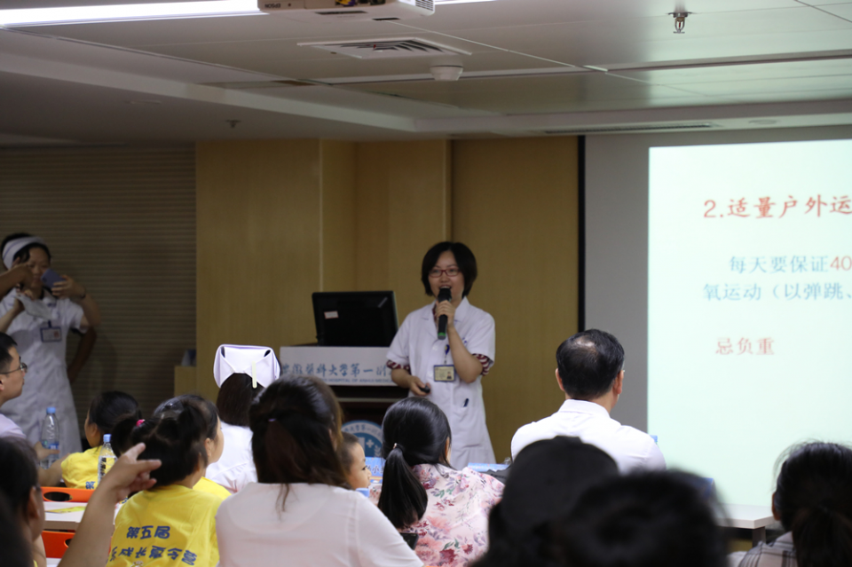 潘道香、代芳、夏莉分别就儿童性早熟、矮小症及肥胖症进行精彩讲课,专家们针对家长们关心的问题进行细致的解答。现场还进行了“跳绳大比拼”,“趣味颠乒乓球”等趣味游戏环节,孩子们踊跃参加,并获得了羽毛球拍等健康小礼品。