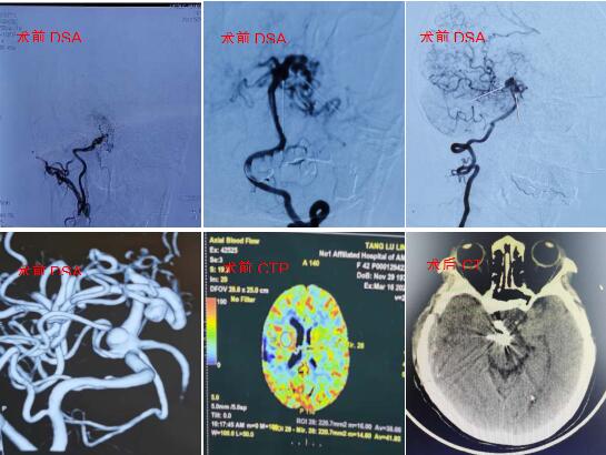 患者唐某,42岁,女性,来自合肥庐江县,系“头晕一月余”就诊于当地医院,CTA提示烟雾病合并基底动脉尖以及右侧大脑后动脉P2段动脉瘤,遂来我院进一步诊治。入院后行全脑血管造影检查,确诊烟雾病合并基底动脉尖以及右侧大脑后动脉P2段动脉瘤,同时CTP提示右侧脑灌注减低。经科室讨论后拟定治疗方案如下:1.先行血管搭桥治疗烟雾病,二期处理颅内动脉瘤;2.先行介入支架辅助栓塞治疗颅内动脉瘤,二期治疗烟雾病,但栓塞术后长期口服抗凝药影响后续治疗;3.同期行颅内后循环多发动脉瘤颅夹闭及右侧血管搭桥加颞肌贴敷。这样既可以解决颅内多发动脉瘤,又能通过搭桥提高右侧脑组织血流量,降低烟雾病导致梗塞风险。但是手术难度大,风险高。与家属充分沟通后,家属选择开颅动脉瘤夹闭+血管搭桥术。