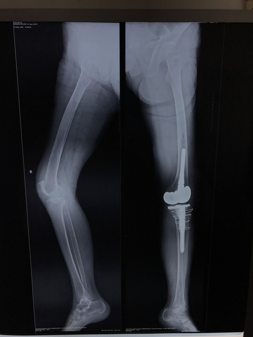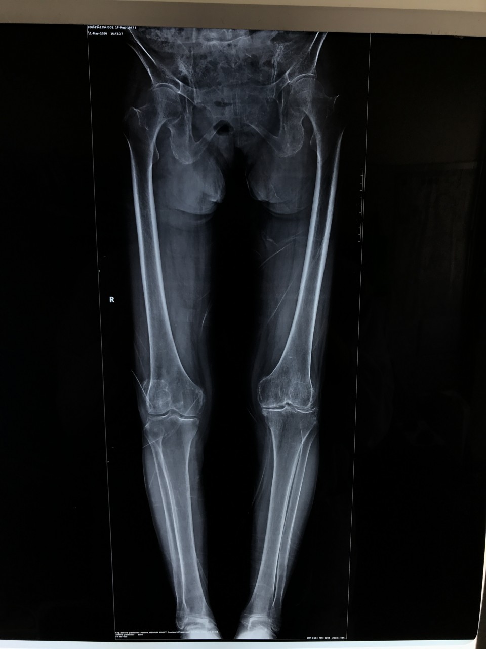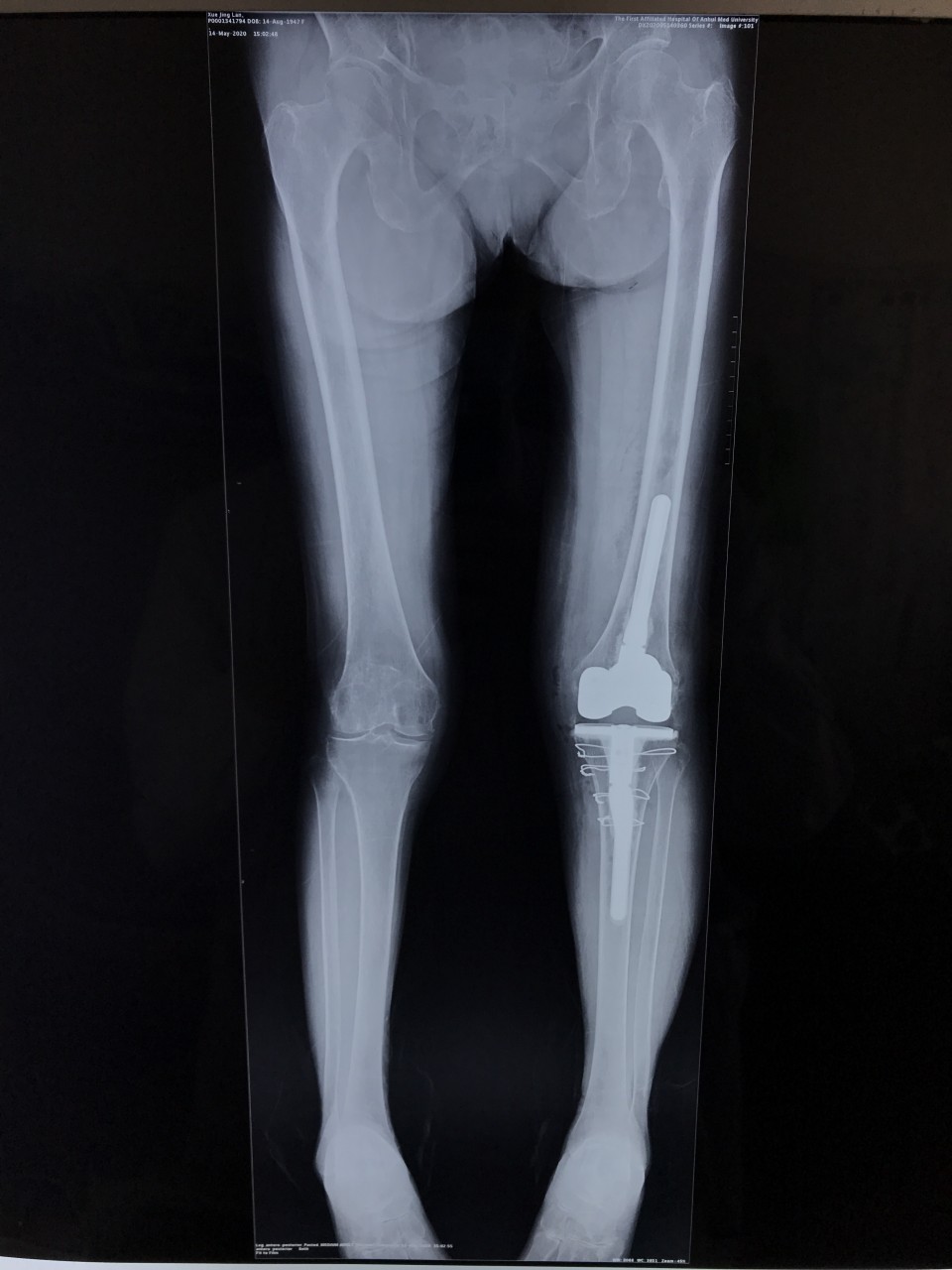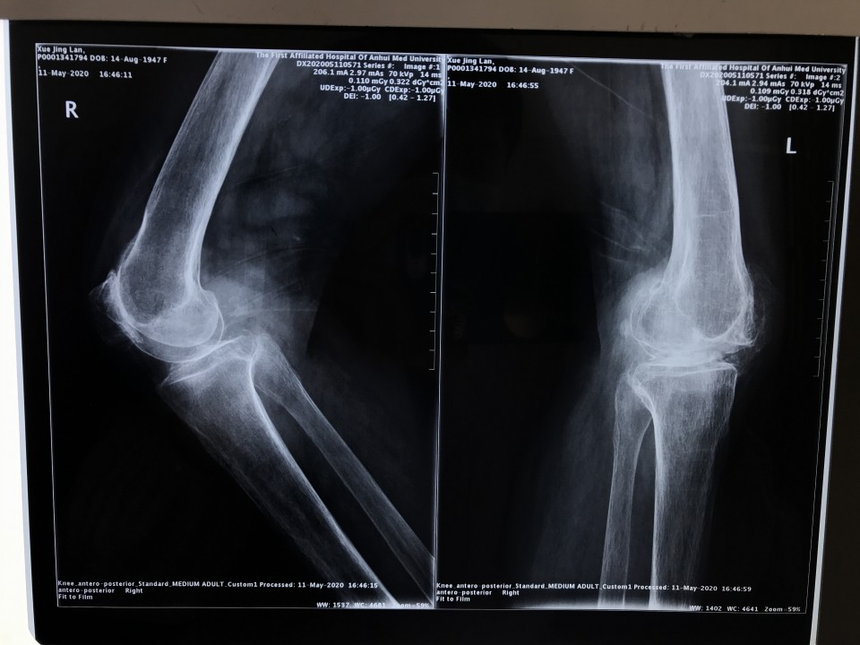 5月11日,一位72岁女性患者因“双膝关节疼痛伴活动受限8年,加重半年”入院,术前摄片提示双侧膝关节骨性关节炎。左侧膝关节伸直型僵直,屈伸活动度范围为0°。 我科胡孔足主任术前结合患者病史,体检及辅助检查,制定详实方案,先行左侧全膝关节置换术,术中采用TTO(胫骨结节截骨术),患者术后第二天下地正常行走,5月18日出院时已经能够完全自主抬腿,膝关节屈曲可达100°,减轻了患者的疼痛,明显提高了生活质量,疗效满意。