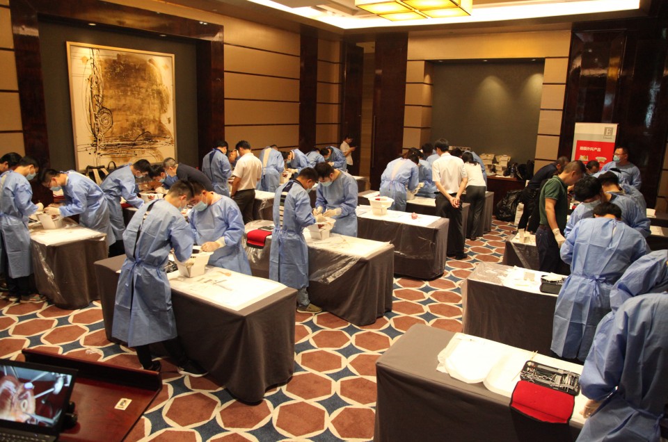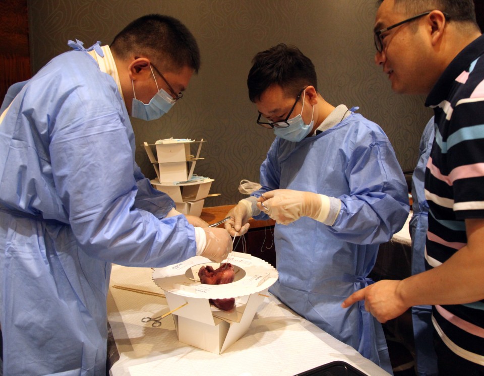 除了专家讲座及交流的形式外,本次论坛还特别开展了一场别开生面的手把手“实战”教学。来自各地市的中青年医生在动物心脏上模拟“搭桥”“换瓣”,专家们仔细讲解了搭桥及换瓣的操作技巧,并进行现场演示和指导。
