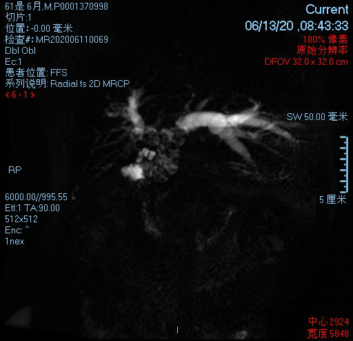 此次手术患者为男性,61岁,因肝内外胆管结石,曾行3次开腹手术治疗,最后一次手术为3年前。本次系上腹部疼痛,结石再次复发入院。入院后完善检查,磁共振提示胆总管、右前叶、右后叶胆管充满大量结石,左肝管扩张明显。该患者既往已行3次胆道手术,如选择传统手术,则手术创伤大、风险高、并发症发生率明显升高。因此,经科室讨论后,并征得患者及其家属理解同意后,于6月29日行经皮经肝胆道硬镜碎石取石术,手术过程为:麻醉后,超声引导穿刺入胆管,扩张后,置入保护性鞘管,胆道硬镜联合钬激光碎石取石,取尽结石后放置引流管。手术顺利,结石基本取尽,手术用时约1小时,腹壁仅有0.5cm微小创口,术后患者恢复顺利,6小时后即可下床活动并可进食,术后第二天患者顺利出院。