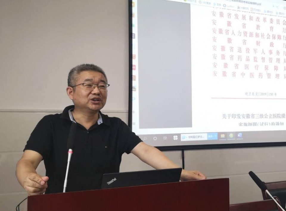 李平首先带领全体住院总、科秘书学习了《安徽省三级公立医院绩效考核实施细则(试行)》文件,详略有序地对65项指标进行梳理解读,从考核指标、等级要求、可行性目标等方面提出指导性意见和建议,对提高三、四级手术占比及合理用药等重点工作作出具体要求。随后结合实际事例,对住院总、科秘书在工作中的主动奉献、互帮互助表示肯定,鼓励大家在岗期间加强交流,打破学科壁垒,形成多个专业团队作战模式,以更好地应对突发及危重症情况,在工作中不断总结经验,开创更多快捷便民的服务举措。最后对住院总、科秘书给予殷切期望,希望他们在维护科室管理、维系高效诊治、监督病案书写等方面继续发挥重要作用,以缩短平均住院日为重点,以预住院政策为推动力,积极推动绩效考核指标和年度计划目标的完成。