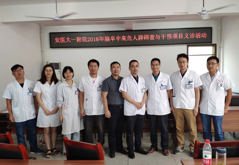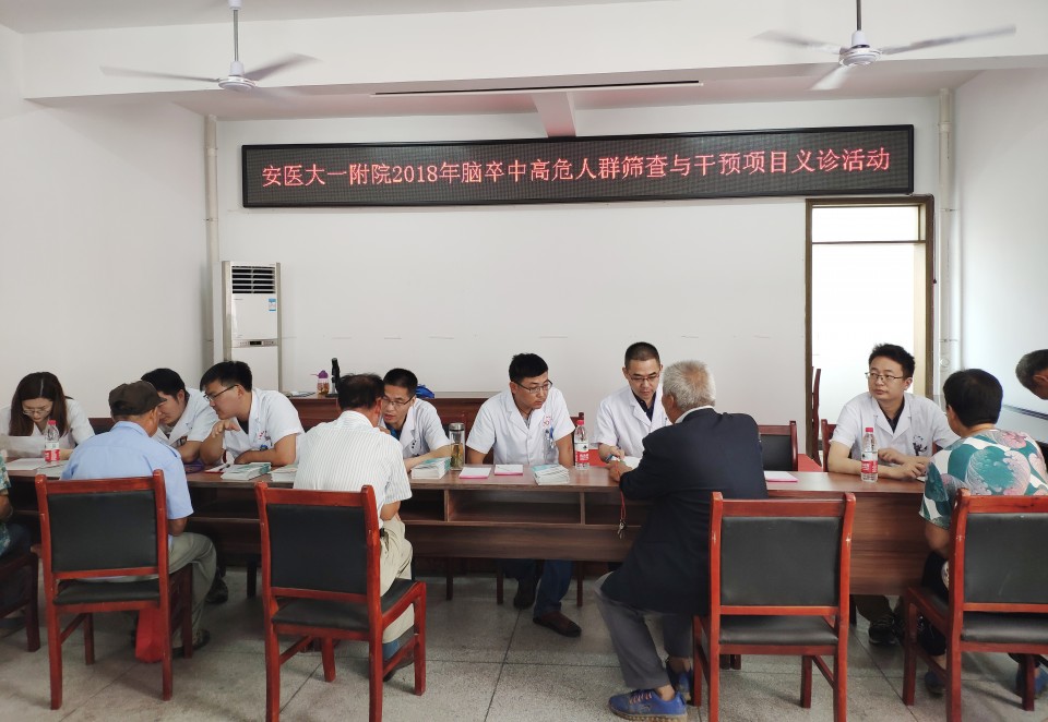 7月14日上午,我院神经内科血管介入治疗组组长杨卫民、王水平及组员魏强、叶立、代晨阳等在肥东县石塘镇中心卫生院门诊楼举办了脑卒中早期防治的义诊活动。据了解,肥东石塘镇中心卫生院是我院2018年脑卒中高危人群筛查与干预项目的基层医疗单位。我院于今年3月份至6月份的三个月期间在此对周边40岁以上的4000余名常住居民进行了脑血管高危因素筛查,并对筛查出的高危人群进行颈部血管彩超的检查。