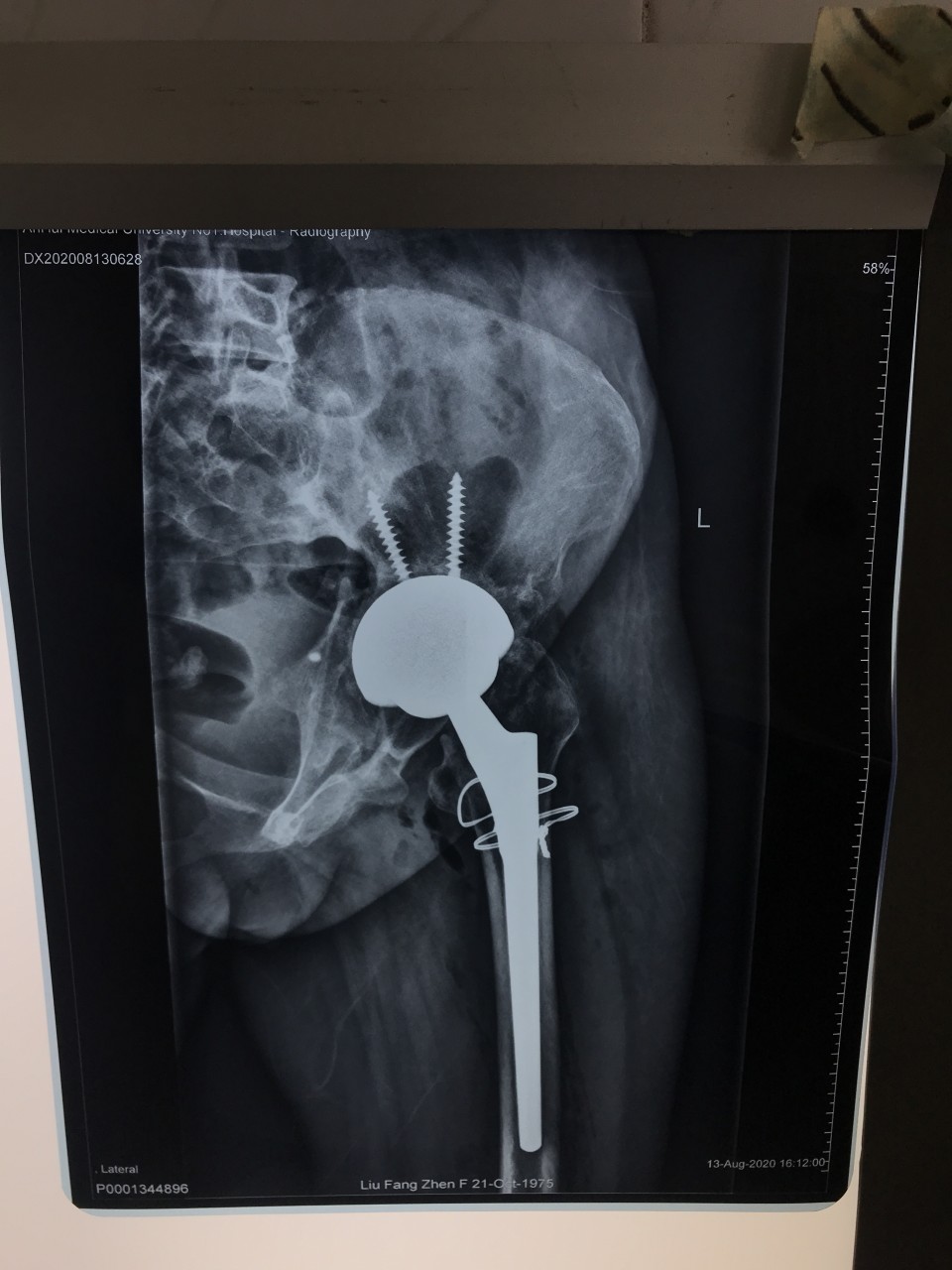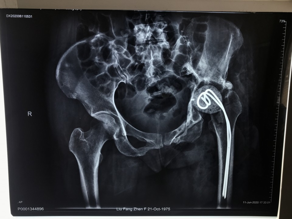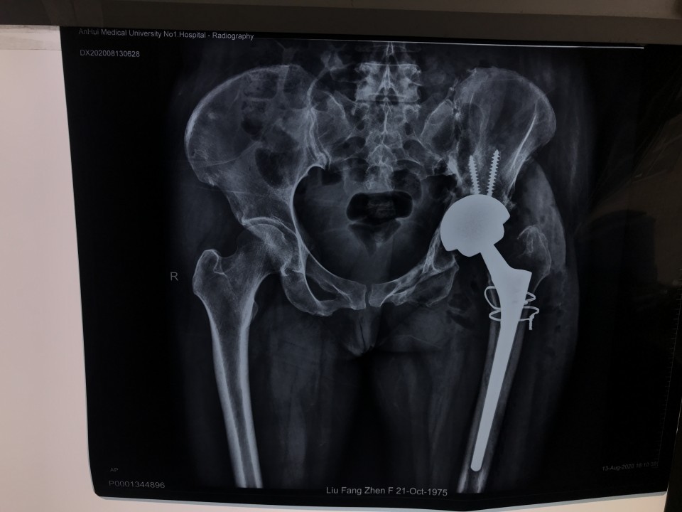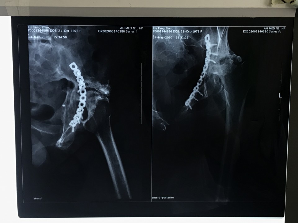 一位44岁女性患者因“左侧骨盆骨折术后疼痛伴渗液8年”入院。患者8年前因左侧骨盆骨折请上海专家行手术治疗,术后恢复不佳,髋关节感染,当地医生将部分钢板取出,残留的钢板因风险极大未予以处理。由于手术不彻底,伤口继续流脓,股骨头坏死,关节疼痛严重。因为手术风险极大,失败率高,多家医院拒收,患者慕名来到我院关节与显微修复外科胡孔足主任专家门诊,胡主任综合考虑各方因素以及现阶段我院的诊疗技术,将患者收治入院予以手术。术前结合患者病史,体检及辅助检查,反复讨论,制定了精细的手术方案,于6月10日,成功行一期手术,取出感染发炎的钢板,植入抗生素占位器。因为钢板和血管神经紧紧粘连在一起,稍有不注意就可能导致大出血,瘫痪、心跳骤停等严重后果。术后培养提示为MRSA,经过两个月规范抗感染治疗,培养提示阴性,未见细菌,感染消失。8月12日,胡主任顺利完成二期手术,“左侧全髋关节置换术”,目前手术后4天,患者已经能够扶拐下地行走,恢复良好,不久将康复出院。