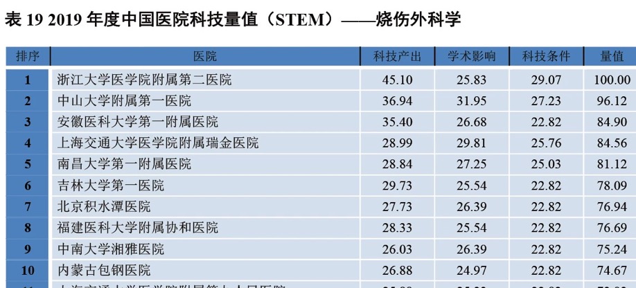 2020年8月21日,2019年度中国医院科技量值(STEM)在北京发布。我科在“中国医院科技量值烧伤外科排行榜中”位列第3。