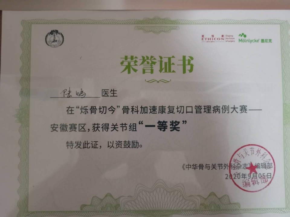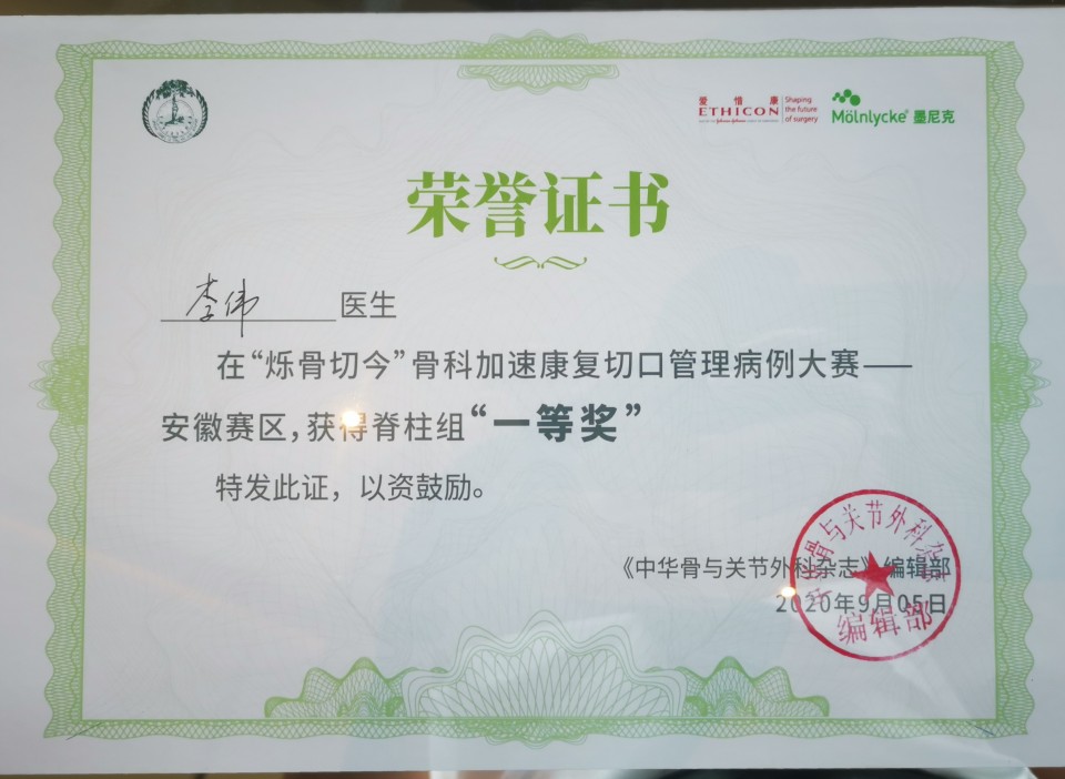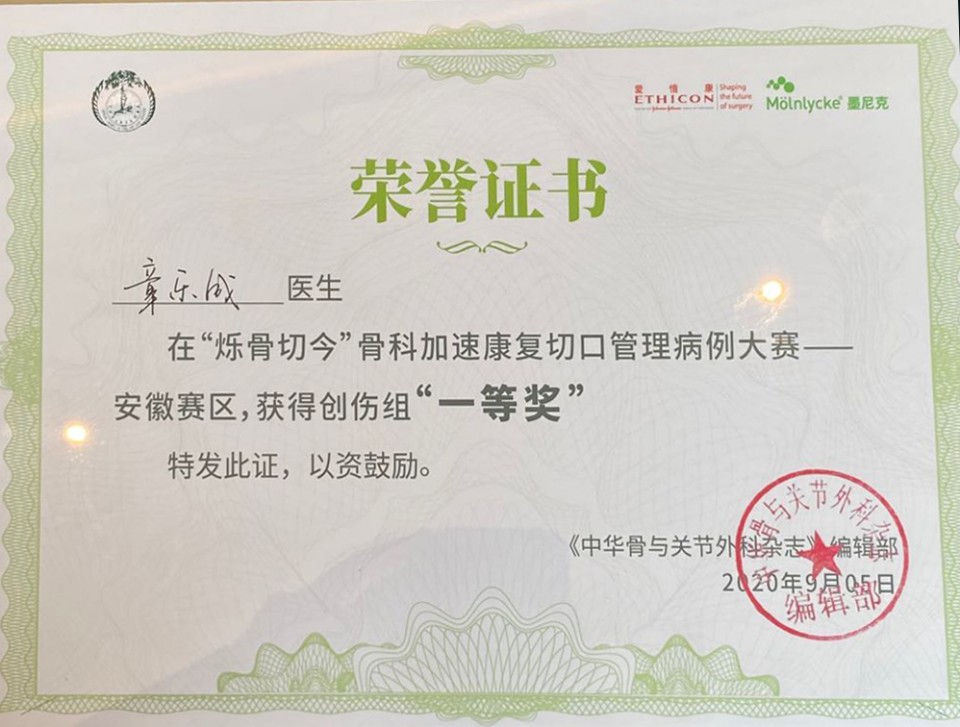 9月5日,由《中华骨与外科杂志》主办,安徽省医学会骨科学分会承办的《中国骨科加速康复切口管理指南》安徽省病例大赛在合肥拉开帷幕,来自全省各地优秀的骨科医师参加了此次比赛。我院骨科医师章乐成、陆鸣、李伟分别在创伤、关节、脊柱组比赛中荣获第一名,并作为安徽省骨科医师的代表参加东区半决赛。